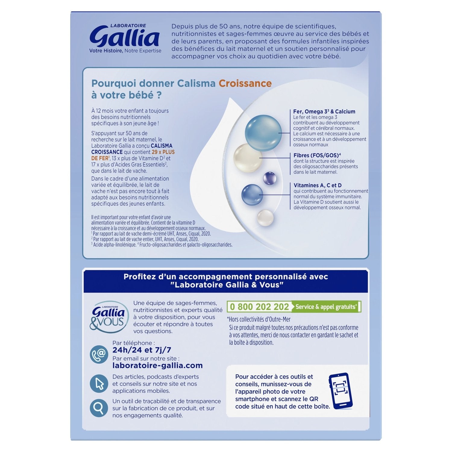 LABORATOIRE GALLIA CALISMA GROWTH (formula for babies from 12 months to 3 years) which contains 29 x MORE IRON1, 13 x more Vitamin D2 and 17 x more Essential Fatty Acids2, than in cow's milk. Based on 50 years of research on breast milk, Laboratoire Gallia has developed this formula to support babies and help meet their specific nutritional needs. (In accordance with the regulations for infant formula.)