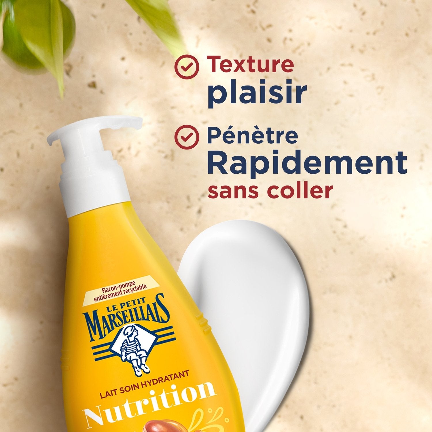 Le Petit Marseillais | Nutrition Moisturizing Body Lotion Le Petit Marseillais has created this Nutrition care and pleasure recipe to offer your skin 24 hours of hydration. It has combined effective ingredients including Shea Butter, Sweet Almond and Argan Oil for nourished and beautiful skin for 24 hours of comfort. Benefits at a glance: • Nutrition care recipe: moisturizes the skin for 24 hours. • Ingredients selected for their effectiveness including: Shea Butter, obtained in a traditional way, Sweet Almond, it is picked at the end of summer then pressed, Argan Oil, honey-colored, rare and precious. • Your skin is happy: beautiful, nourished and moisturized for 24 hours of comfort. • Deliciously gourmet fragrance and pleasant texture: this milk absorbs quickly without sticking • Fully recyclable pump bottle • Dermatologically tested