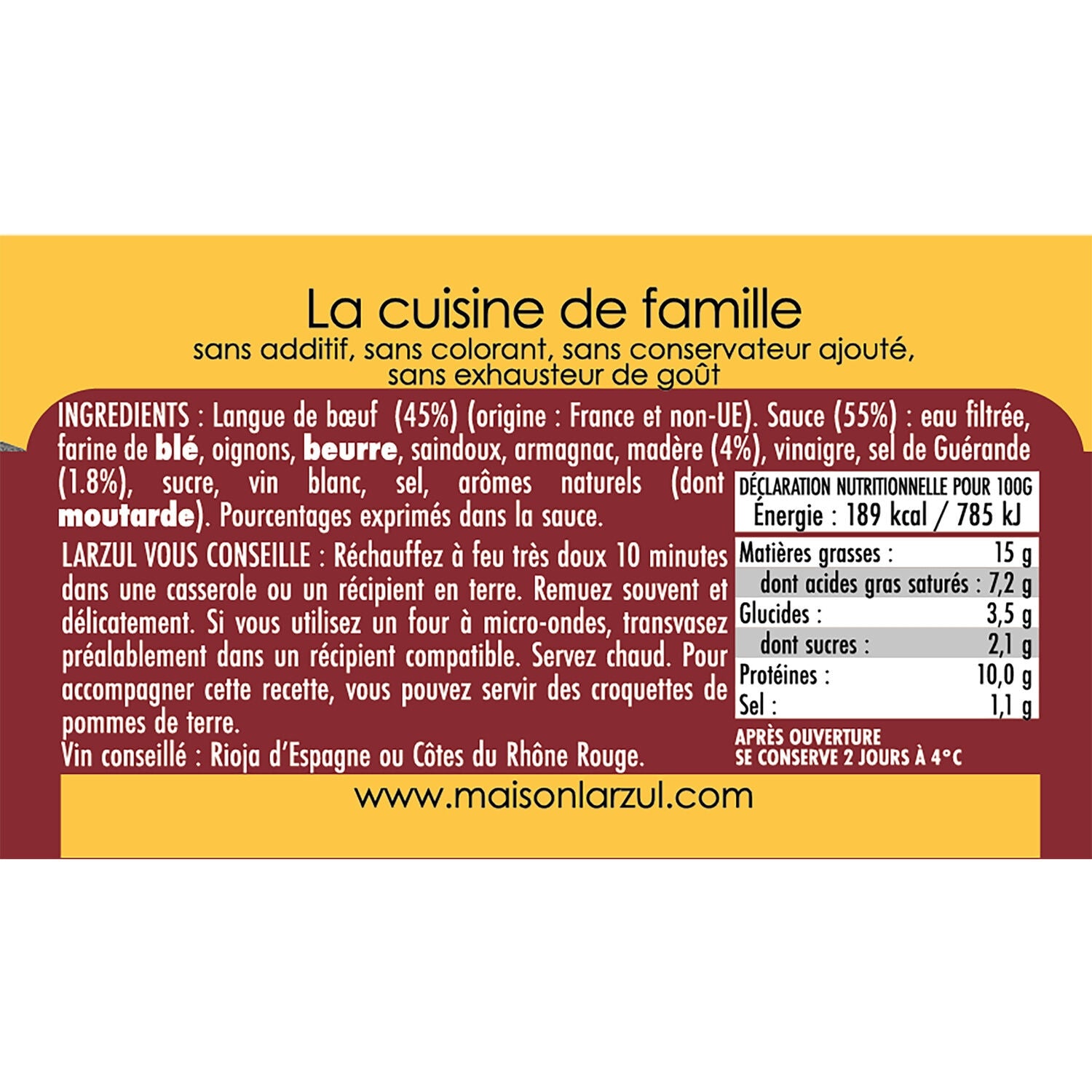 Ingredients: Beef tongue (45%) (origin: France and non-EU). Sauce (55%): filtered water, WHEAT flour, onions, butter, lard, Armagnac, Madeira (4%), vinegar, Guérande salt (1.8%), sugar, white wine, salt, natural flavorings (including MUSTARD). Percentages expressed in the sauce.