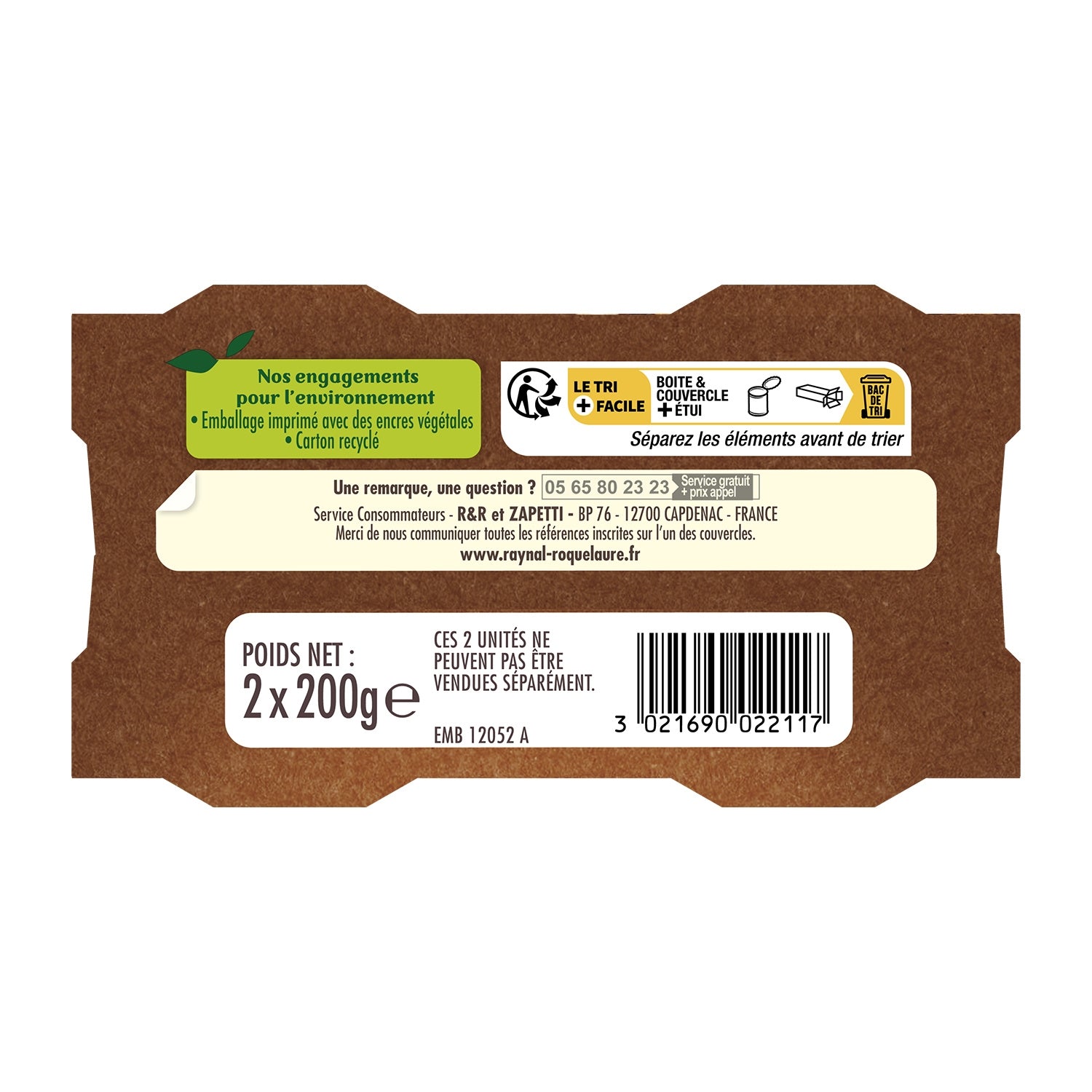 Discover our full range of cooked vegetables at www.raynal-roquelaure.fr Our commitments to the environment: - Packaging printed with vegetable inks - recycled cardboard No preservatives - No artificial flavorings