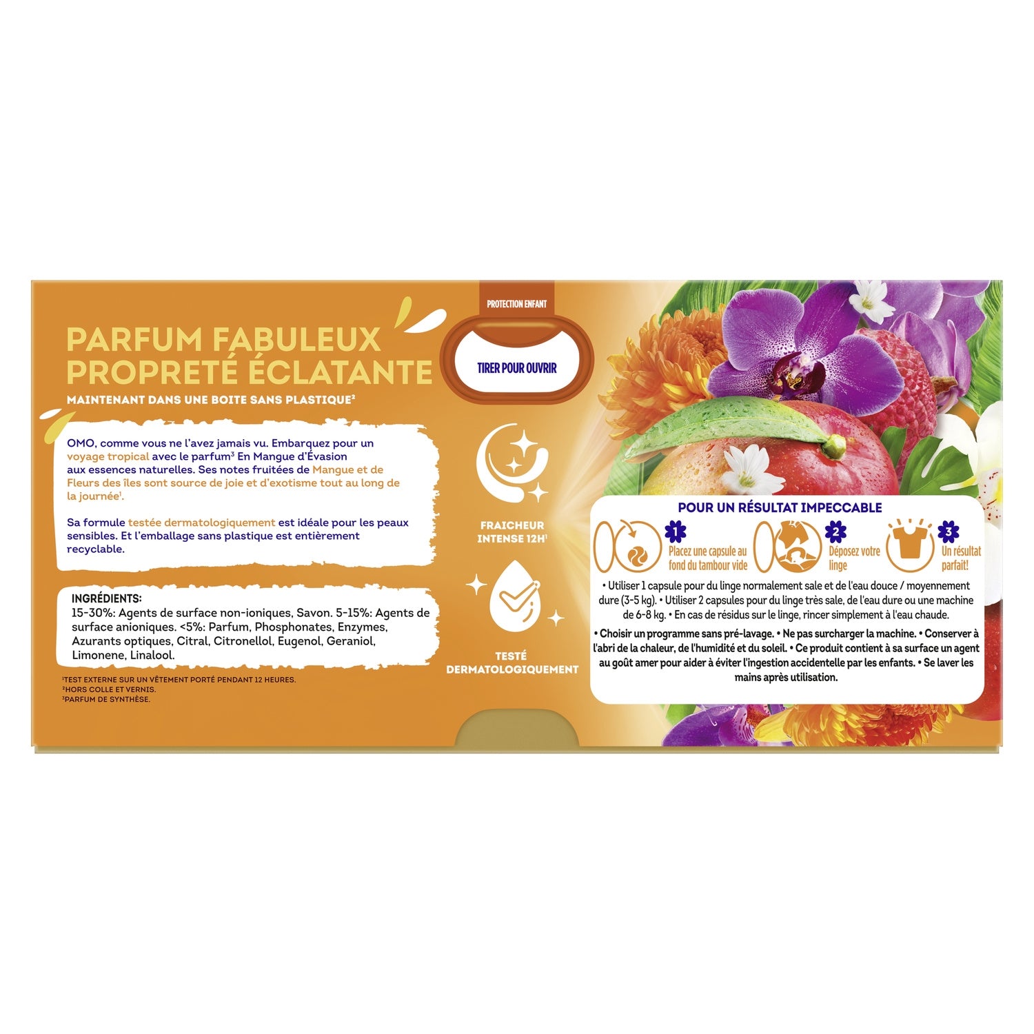 New OMO 3-in-1 laundry capsules Mango & Island Flowers 29 Washes for intense freshness and a fabulous fragrance all day long¹.,Embark on a tropical journey with the fragrance³ En Mangue d'Evasion with natural essences.,The fruity notes of Mango and Island Flowers in this laundry detergent are a source of joy and exoticism all day long.,The OMO 3-in-1 laundry capsule dissolves instantly even in cold and short cycles for a sparkling clean.,Its dermatologically tested formula is ideal for sensitive skin.,OMO laundry capsules are now in fully recyclable cardboard packaging.