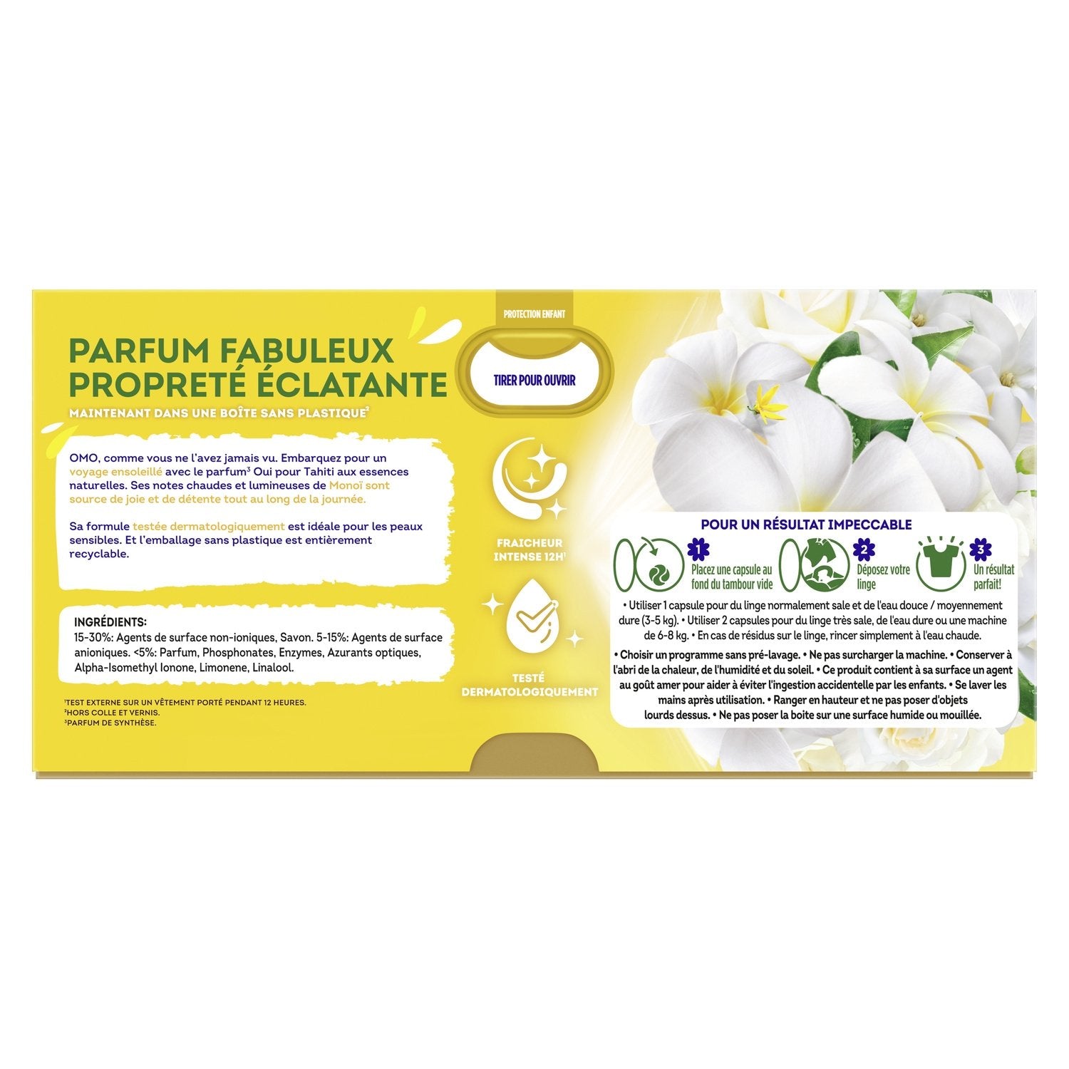 New OMO Monoï 3-in-1 laundry detergent capsules 29 Washes for intense freshness and a fabulous fragrance all day long¹.,Embark on a sunny journey with the Oui pour Tahiti fragrance³ with natural essences.,The warm and luminous notes of Monoï in this laundry detergent are a source of joy and relaxation all day long.,The OMO 3-in-1 laundry detergent capsule dissolves instantly even in cold water and on short cycles for a sparkling clean.,Its dermatologically tested formula is ideal for sensitive skin.,OMO laundry detergent capsules are now in fully recyclable cardboard packaging.