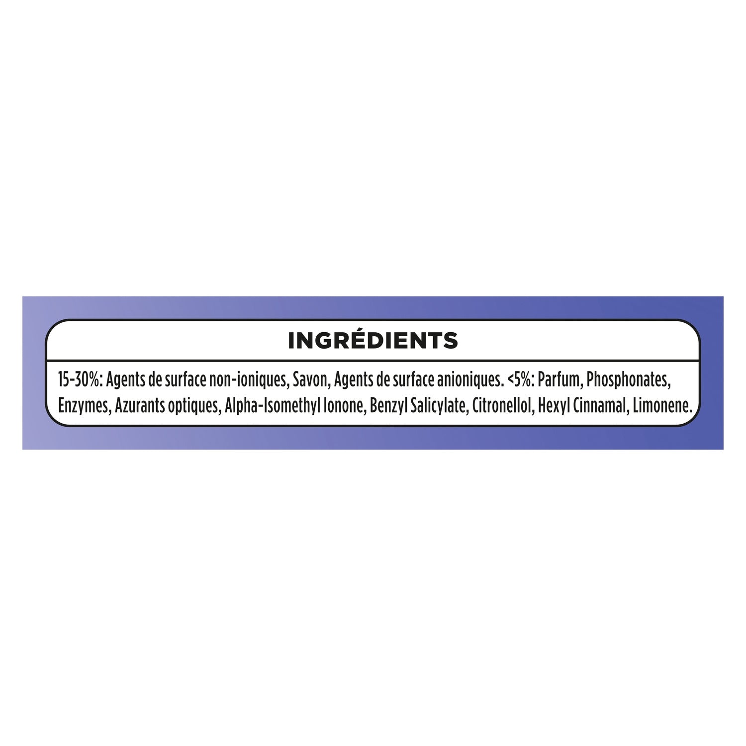 INGREDIENTS: 15-30%: Non-ionic Surfactants, Soap, Anionic Surfactants. <5%: Perfume, Phosphonates, Enzymes, Optical Brighteners, Alpha-Isomethyl Ionone, Benzyl Salicylate, Citronellol, Hexyl Cinnamal, Limonene.