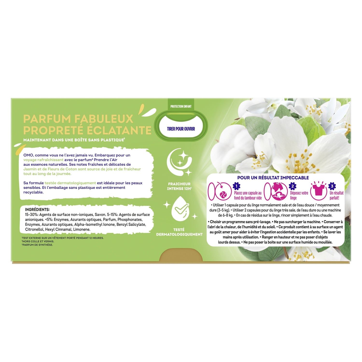 New OMO 3-in-1 Jasmine & Cotton Flower Laundry Capsules 29 Washes for intense freshness and a fabulous fragrance all day long¹.,Embark on a refreshing journey with the fragrance³ Take Air with natural essences.,The fresh and delicate notes of Jasmine and Cotton Flowers in this laundry detergent are a source of joy and freshness all day long.,The OMO 3-in-1 laundry capsule dissolves instantly even in cold and short cycles for a sparkling clean.,Its dermatologically tested formula is ideal for sensitive skin.,Omo laundry capsules are now in fully recyclable cardboard packaging.
