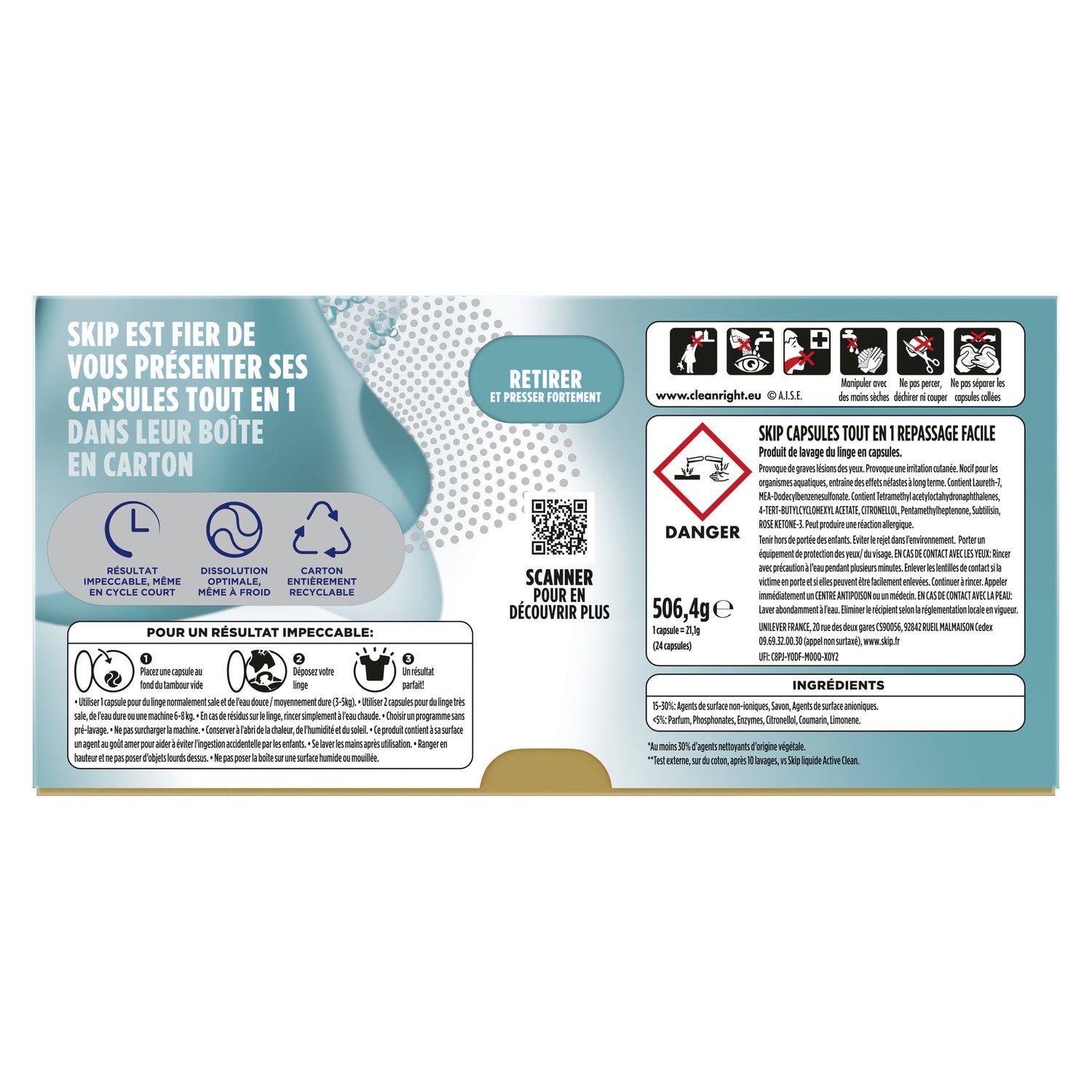 Skip Easy Ironing 24 Wash Capsule Laundry Detergents allow for 50% faster ironing and optimal glide thanks to Easy Gliss™ technology.,This capsule laundry detergent guarantees impeccable results, even in short cycles.,This new Skip capsule laundry detergent ensures rapid dissolution without residue, even in short cycles and from 30°C, while reducing CO₂ emissions.,Skip capsule laundry detergent is designed with active ingredients of plant origin*.,Place one capsule at the bottom of the empty drum before adding your laundry. Use 2 capsules for heavily soiled laundry, hard water or a 6-8 kg machine.,All the effectiveness of Skip laundry detergent now in fully recyclable cardboard packaging.
