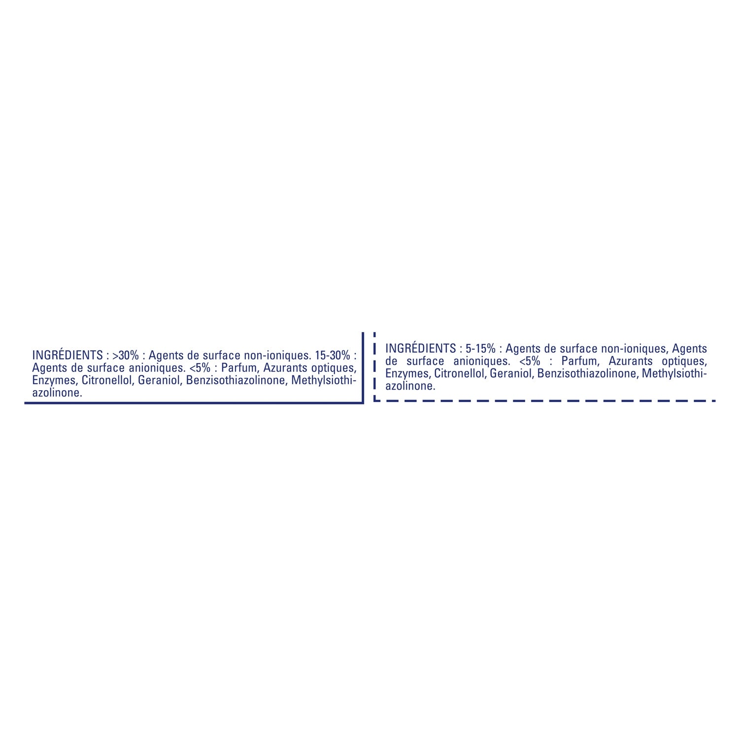 Detergent to dilute: INGREDIENTS: > 30%: Non-ionic surfactants. 15-30%: Anionic surfactants. <5%: Optical brighteners, Enzymes, Citronellol, Geraniol, Benzisothiazolinone, Methylsiothiazolinone. Detergent diluted with 1L of water: INGREDIENTS: 5-15%: Anionic surfactants, non-ionic surfactants 5%: Perfume, Optical brighteners, Enzymes, Citronellol, Geraniol, Benzisothiazolinone, Methylsiothiazolinone.