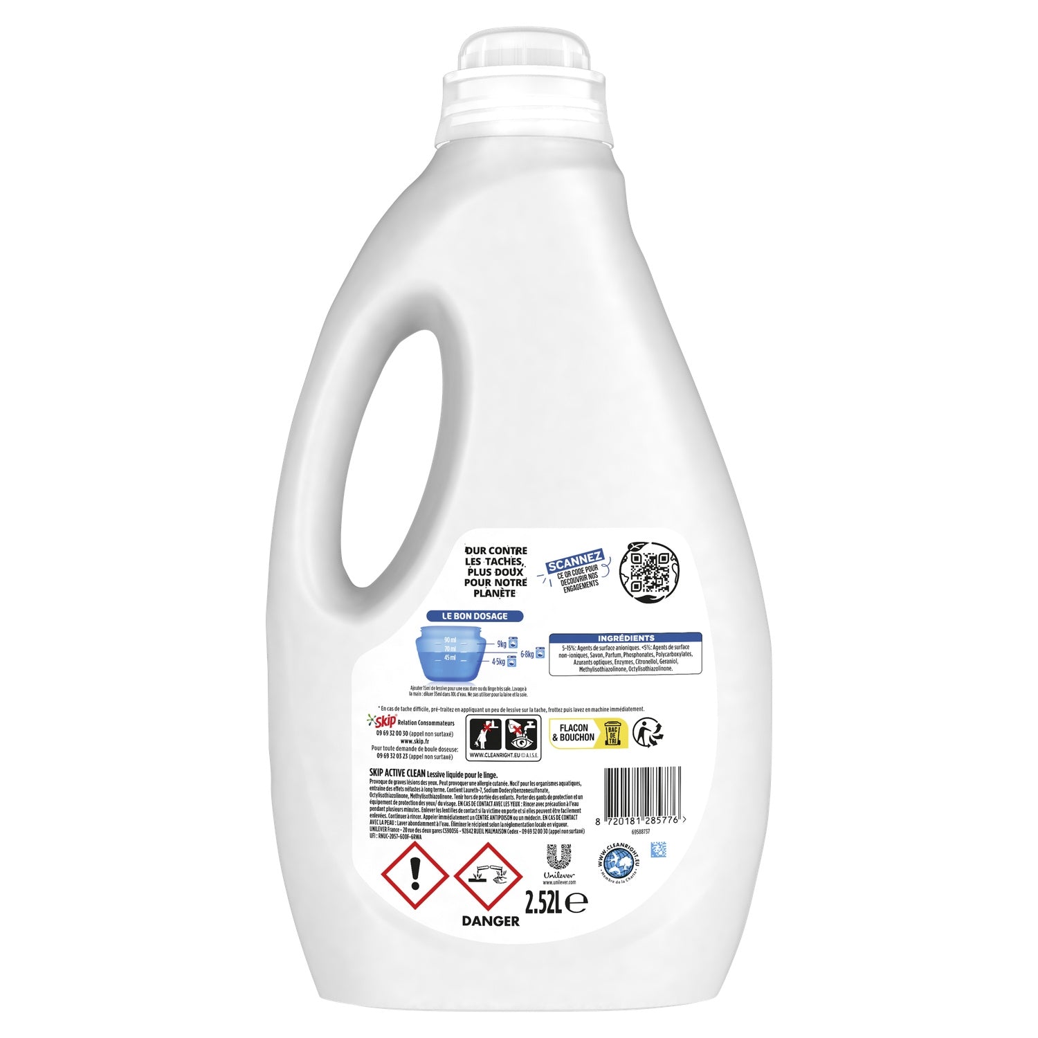Skip Active Clean 56-wash liquid detergent delivers 100% flawless results. Gentle on skin and tough on stains: chocolate, grass, ice cream, coffee, or tomato sauce... even the toughest, most stubborn stains can't resist Skip liquid detergent. Ideal for low-temperature washes, Skip Active Clean detergent is effective in short cycles and from 30°C, dissolves instantly, and penetrates deep into the laundry. Its bleach-free formula removes stains from your clothes while respecting fibers and colors. With Skip liquid detergent, save energy with every wash and reduce CO₂ emissions. This liquid detergent is suitable for automatic dosing washing machines (auto-dose). Skip Active Clean delivers flawless results while caring for your laundry and leaves your laundry with a pleasant, long-lasting fragrance! What's more, its plastic bottle is fully recyclable and made from recycled plastic. Pour one dose into your machine's detergent dispenser. 45 ml: Recommended dosage for medium to medium water hardness. Add 15 ml of detergent for hard water or heavily soiled laundry. Hand wash: Dilute 35 ml in 10 L of water. Stain pretreatment: 1. Place a small amount of Skip liquid detergent on the stains 2. Rub gently 3. Start the wash cycle immediately. Skip represents more than 60 years of expertise and innovation in the field of laundry detergents, always guided by a desire to improve the daily lives of families. Skip also represents a unique brand philosophy! At Skip, we are convinced that our children need to experiment, play outside and discover the world around them with complete peace of mind, in order to prepare for tomorrow. Therefore, each stain can be synonymous with a moment of joy and sharing, a successful challenge or a new adventure. For us, dirty clothes are the mark of action. That's why our laundry detergents are effective on even the toughest stains. With Skip, dirt is good and always will be. Skip is committed to taking care of your laundry through life and everyday life!