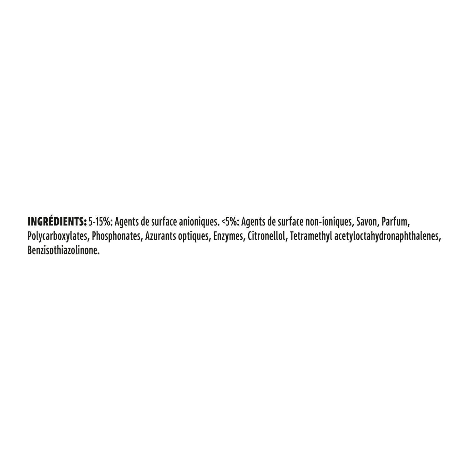 5-15%: Anionic surfactants. <5%: Non-ionic surfactants, Soap, Perfume, Polycarboxylates, Phosphonates, Optical brighteners, Enzymes, Citronellol, Tetramethyl Acetyloctahydronaphthalenes, Methylisothiazolinone, Octylisothiazolinone.