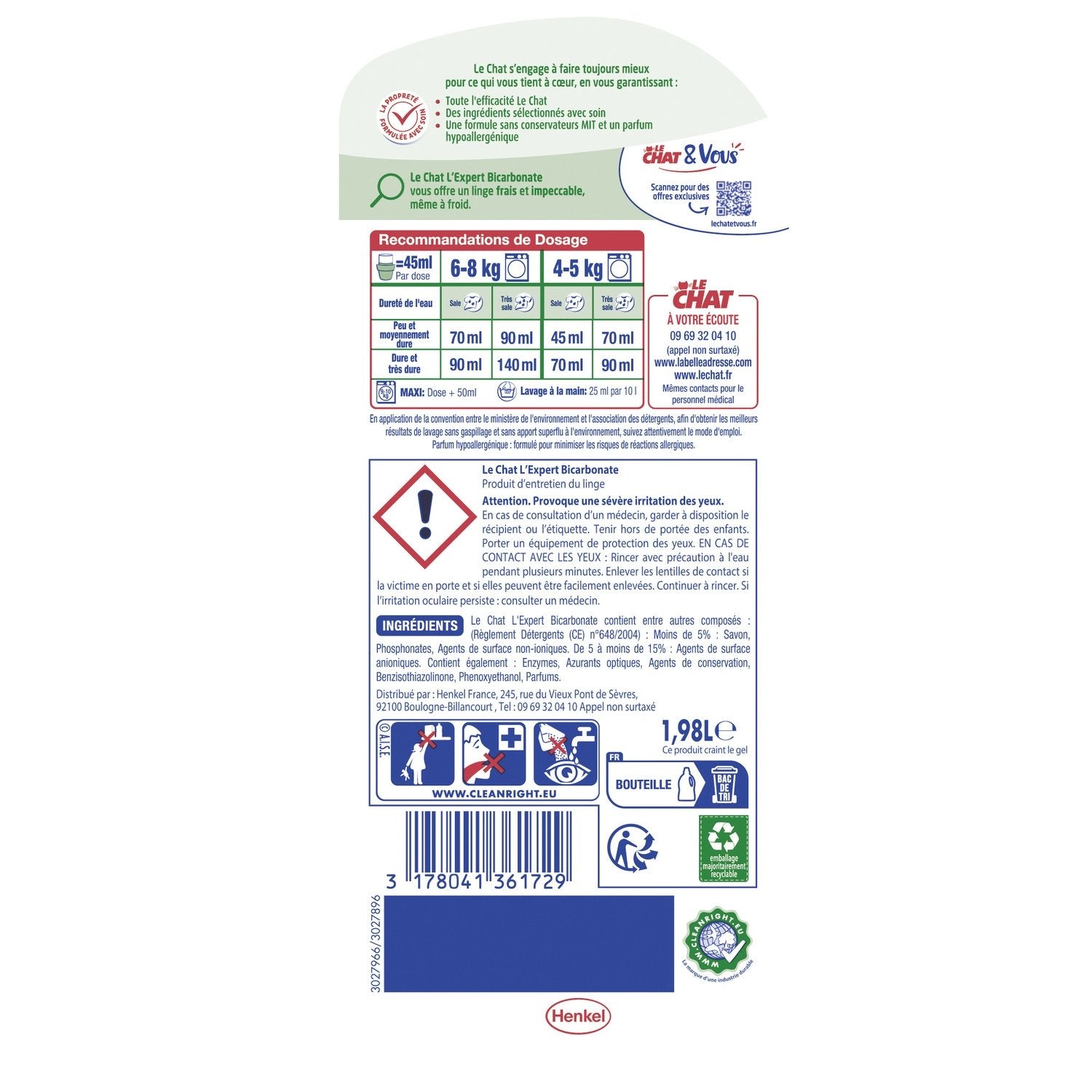 Le Chat is committed to always doing better for what matters to you, by guaranteeing you: - All the effectiveness of Le Chat - Carefully selected ingredients - A formula without MIT preservatives and a hypoallergenic fragrance Le Chat L'Expert Bicarbonate, enriched with ingredients of natural origin, gives you fresh and impeccable laundry - even in cold water