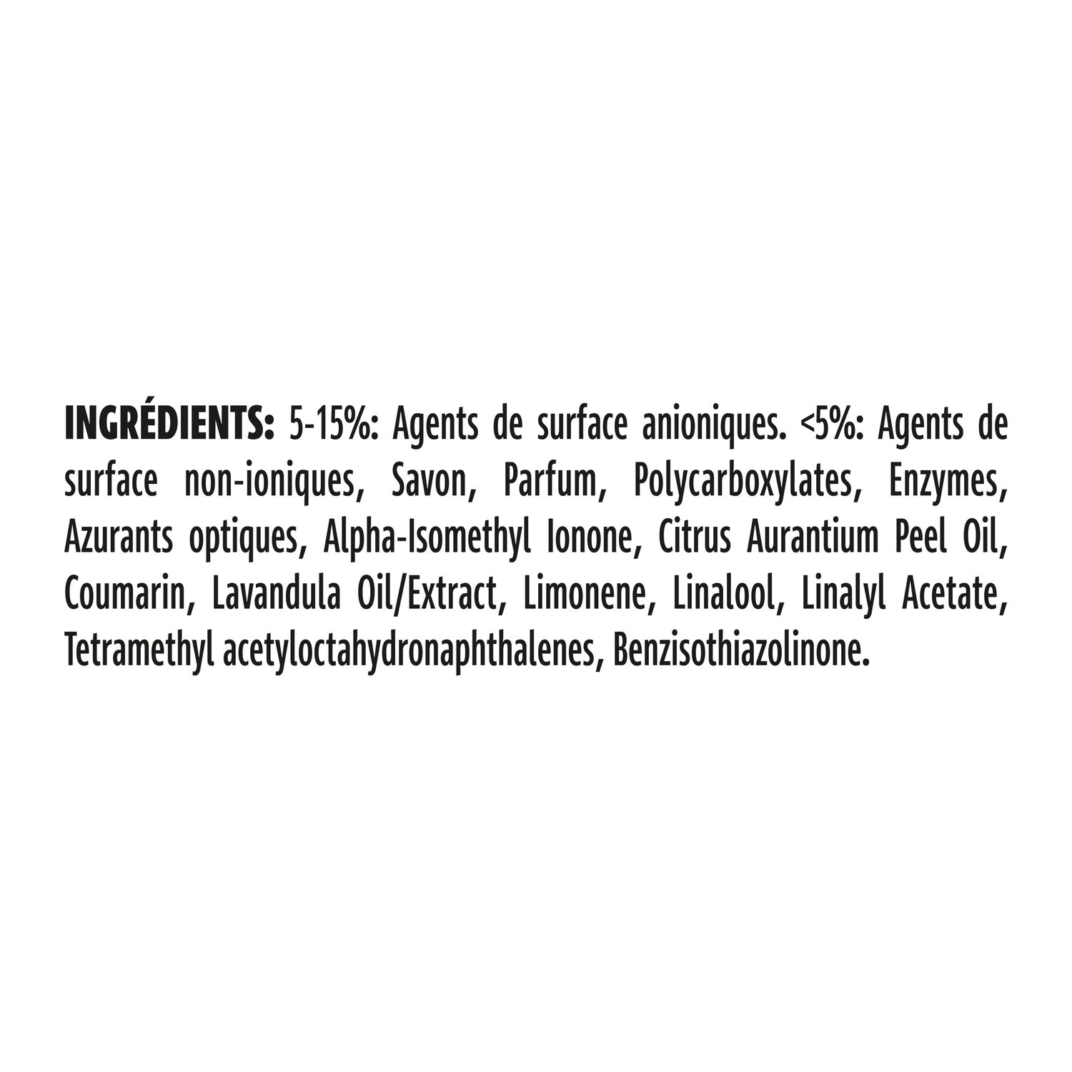 5-15%: Anionic surfactants. <5%: Non-ionic surfactants, Soap, Perfume, Polycarboxylates, Optical brighteners, Enzymes, Alpha-Isomethyl Ionone, Citrus Aurantium Peel Oil, Coumarin, Lavandula Oil/Extract, Limonene, Linalool, Linalyl Acetate, Tetramethyl Acetyloctahydronaphthalenes, Methylisothiazolinone, Octylisothiazolinone.