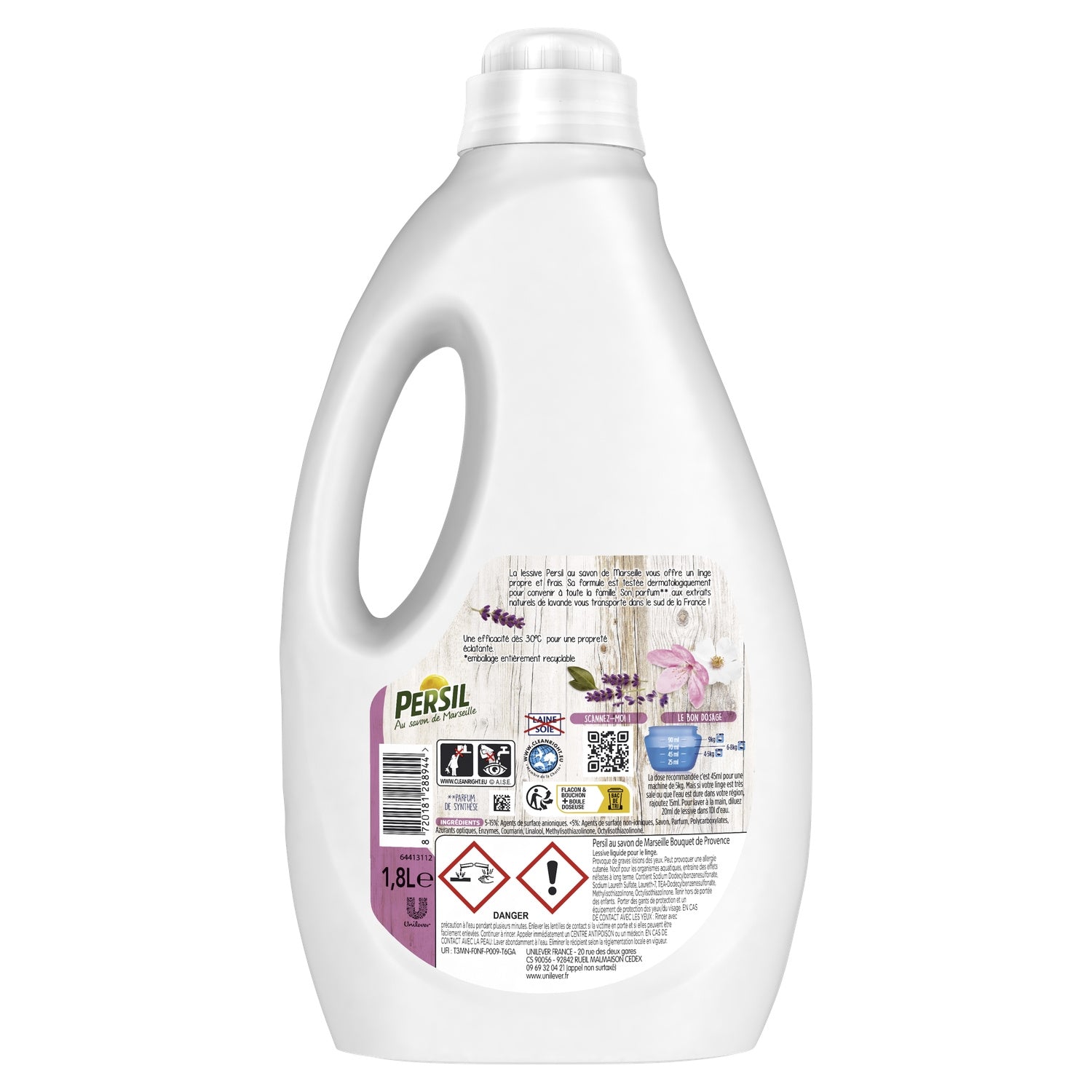 Persil Bouquet de Provence laundry detergent with Marseille soap offers you complete care for clean and fresh laundry.,Its floral fragrance with natural lavender extracts transports you to the south of France!,Its Marseille soap formula dissolves instantly and penetrates to the heart of the laundry to give you sparkling cleanliness.,A 40-wash detergent at a low price and effective from 20°C.,The formula of this detergent is dermatologically tested to be suitable for the whole family.,A liquid detergent in a recyclable bottle containing 50% recycled plastic.