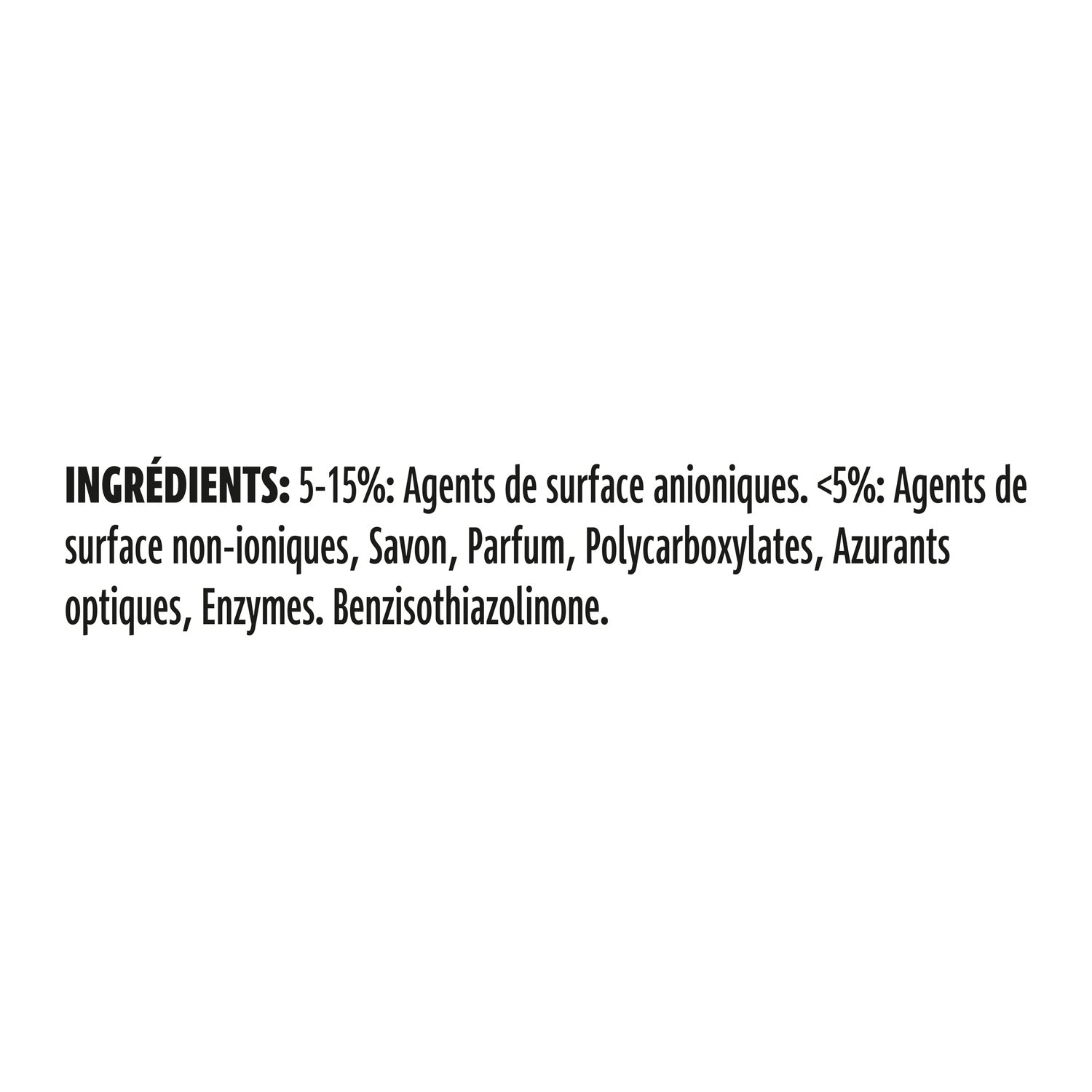 5-15%: Anionic surfactants. <5%: Non-ionic surfactants, Soap, Perfume, Polycarboxylates, Optical brighteners, Enzymes, Methylisothiazolinone, Octylisothiazolinone.