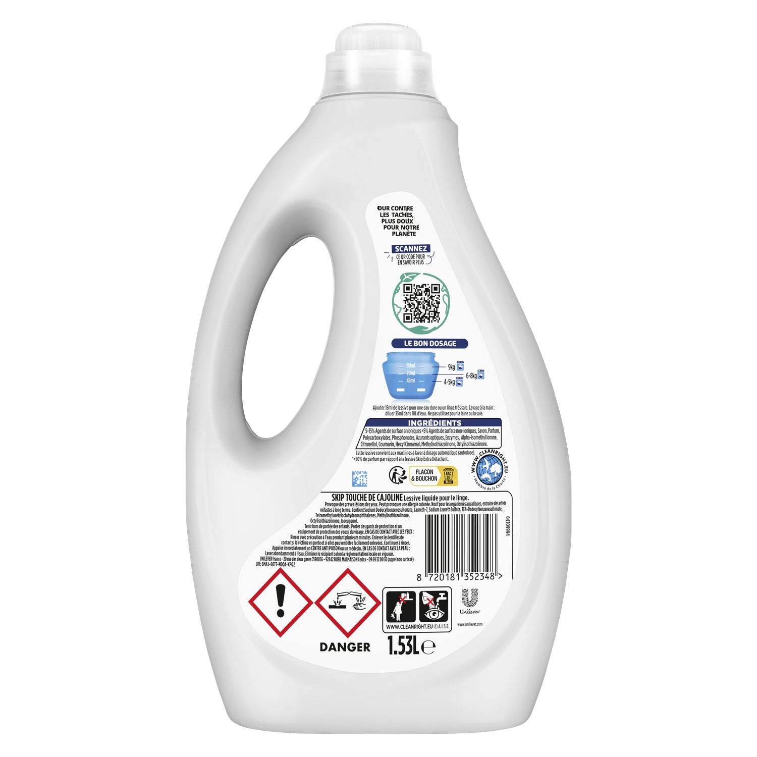 Skip Touche de Cajoline 34 Wash Liquid Laundry Detergent removes stains deep down while leaving your laundry fresh and soft.,With plant-based active ingredients, Skip Touche de Cajoline will transport you with its fresh fragrance inspired by the delicate fragrances of Cajoline fabric softeners.,Thanks to its unique technology, Skip Touche de Cajoline laundry detergent guarantees 100% impeccable results on stains.,Skip liquid laundry detergent is effective in short cycles and from 30°C. With Skip liquid laundry detergent, save energy with every wash and reduce CO₂ emissions.,45 ml: recommended dosage for low to medium water hardness. Add 15 ml of detergent for hard water or heavily soiled laundry. Hand wash: dilute 35 ml in 10 L of water.,Discover all the freshness and softness of Skip Touche de Cajoline laundry detergent packaged in a bottle made with 50% recycled plastic and fully recyclable.