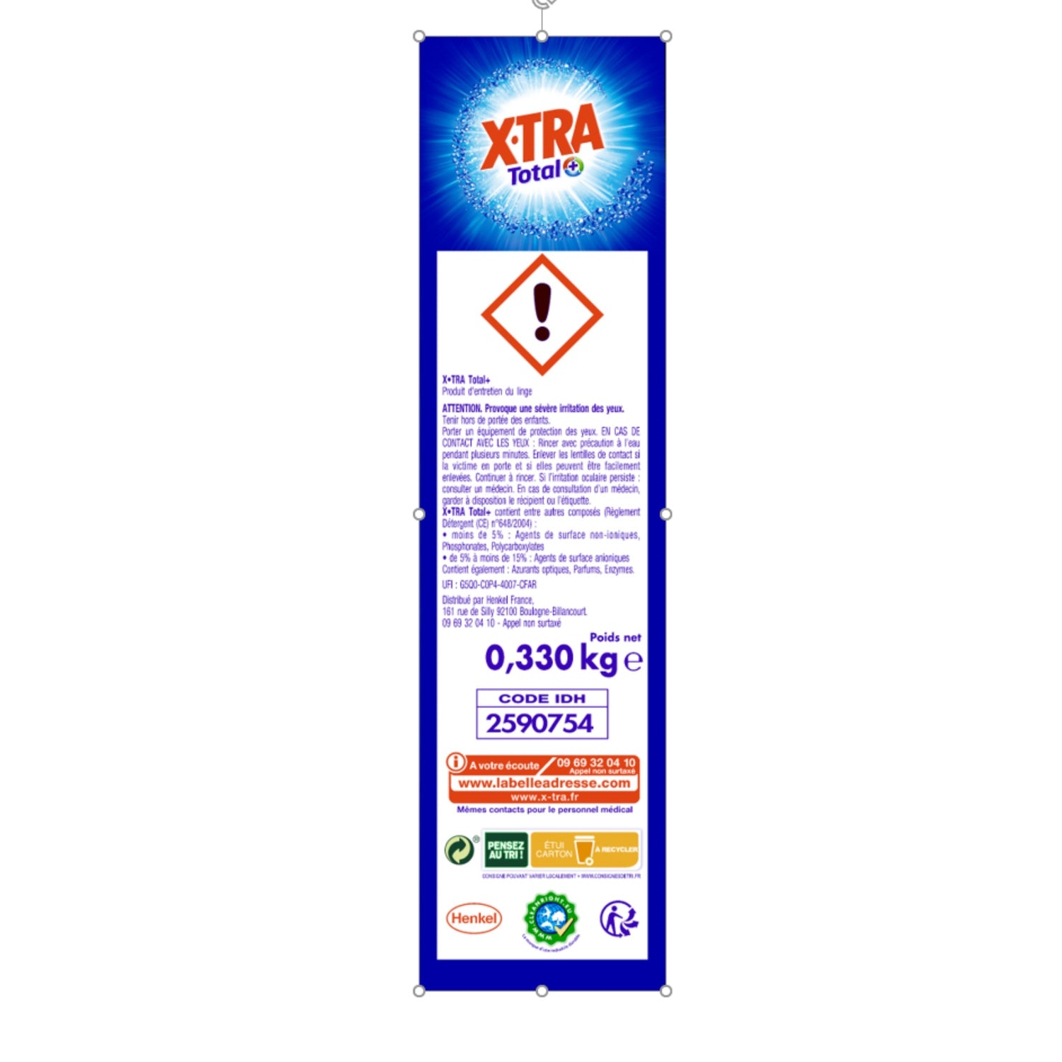 X•TRA Total+ is a single detergent for all fabrics, at any temperature. Its formula ensures bright whites and vibrant colors, wash after wash. For impeccable laundry, always at an X tra price! * IRI Data, Volume Sales, Total Universal Laundry Market, Total France (HM+SM+HD+DRIVE), 2013 to 2019 Caution. Causes serious eye irritation. Keep out of reach of children. Wear eye protection. In case of contact with eyes: Rinse cautiously with water for several minutes. Remove contact lenses, if present and easy to do. Continue rinsing. If eye irritation persists: Get medical advice/attention. If medical advice is needed, have product container or label at hand.