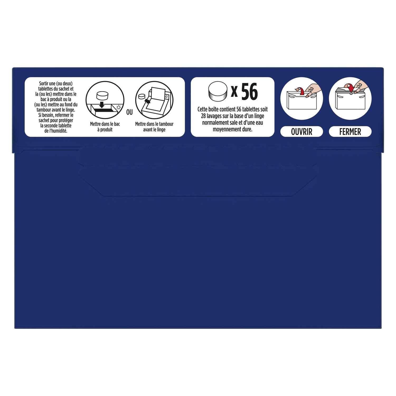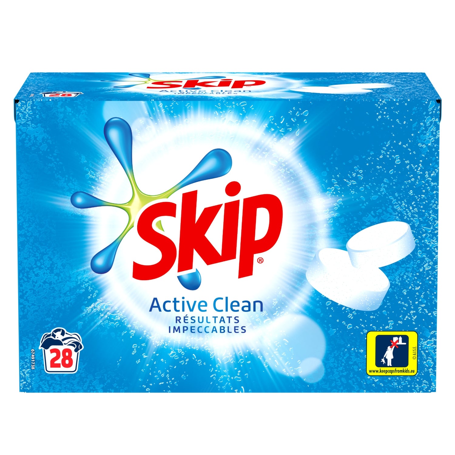 Skip Active Clean 56 Wash Laundry Tablets guarantee impeccable cleanliness and long-lasting freshness while caring for fibers for vibrant clothes. Effervescent, Skip Active Clean laundry tablets contain bleaching agents and optical brighteners that remove the toughest stains like coffee, strawberries, chocolate mousse, or tomato sauce. Thanks to its bleaching agents, it is particularly recommended for the care of light or white fabrics. The tablets dissolve quickly for effectiveness from the start of the wash cycle. Practical to use, Skip laundry tablets allow precise, simple, and quick dosing: two tablets are enough for sparkling cleanliness. No more risk of waste! Remove the tablets from their packaging and follow the instructions according to your machine type. Place in the detergent drawer or directly at the bottom of the drum before washing. Skip is committed to the planet! All the effectiveness of Skip against stubborn stains in fully recyclable cardboard packaging. Skip represents more than 60 years of expertise and innovation in the field of laundry detergents, always guided by a desire to improve the daily lives of families. Skip also represents a unique brand philosophy! At Skip, we are convinced that our children need to experiment, play outside, and discover the world around them with complete peace of mind, in order to prepare for tomorrow. Thus, each stain can be synonymous with a moment of joy and sharing, a successful challenge, or a new adventure. For us, dirty clothes are the mark of action. That's why our detergents are effective on stains, even the toughest. With Skip, dirt is good and always will be. Skip is committed to taking care of your laundry through life and everyday life!