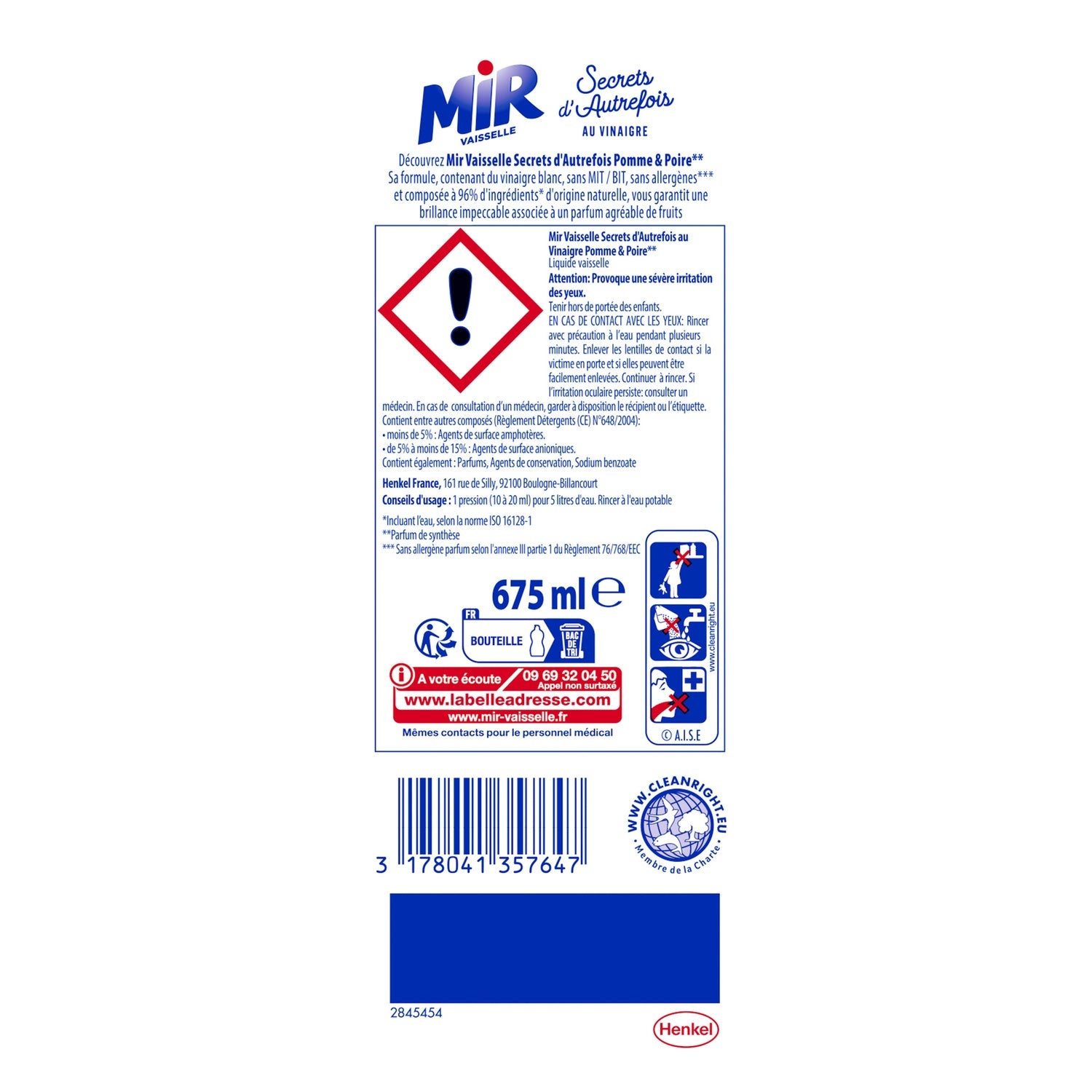 This dishwashing liquid ensures maximum efficiency thanks to the power of white vinegar: shine and anti-limescale Mir dishes is recognized for the traditional super power of its range: cleaning and degreasing Mir Apple Pear releases a pleasant fruity fragrance* The entire Mir Dishwashing range is manufactured in 100% recycled and recyclable plastic bottles