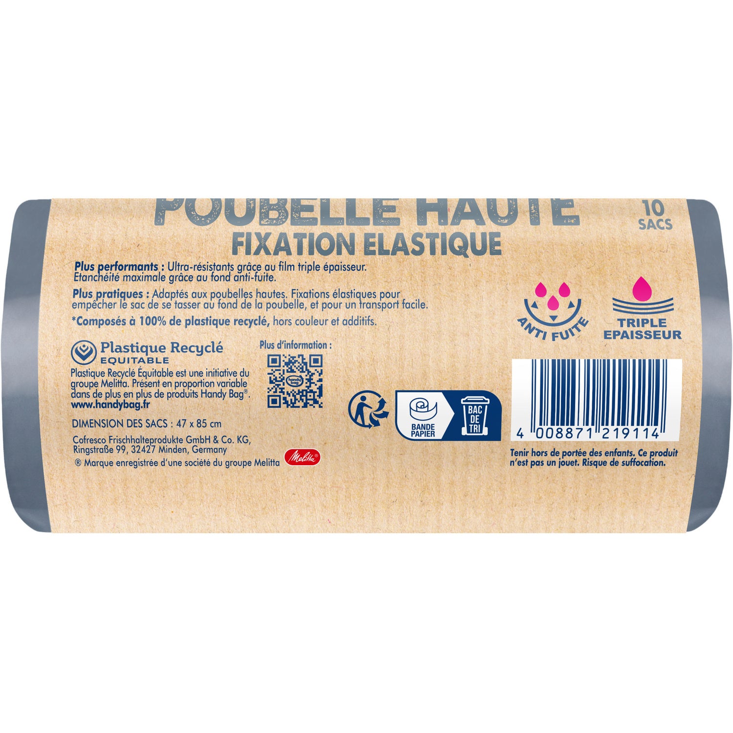 The High Bin elastic fastening bag does not settle at the bottom of the bin, and is easy to close and carry. It is leak-proof thanks to its triple-layer film and leak-proof base. Remember to sort: the paper strip protecting this product is made of 100% recycled and 100% recyclable paper. Be sure to dispose of this packaging in the recycling bin.