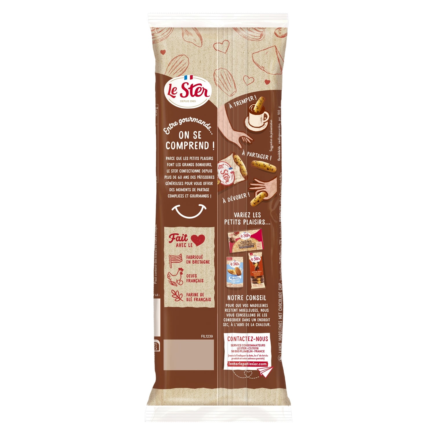 ENJOY THE LONG LE STER MADELEINE WITH THE DELICIOUS TASTE OF CHOCOLATE CHIPS. ITS SECRET? IT IS MADE WITH FRESH EGGS AND FRENCH WHEAT FLOUR. GUARANTEED PALM OIL AND PRESERVATIVE-FREE, IT WILL DELIGHT THE TASTE BUDS OF CHILDREN AND ADULTS THANKS TO ITS SOFTNESS. PRODUCT MADE IN FRANCE.