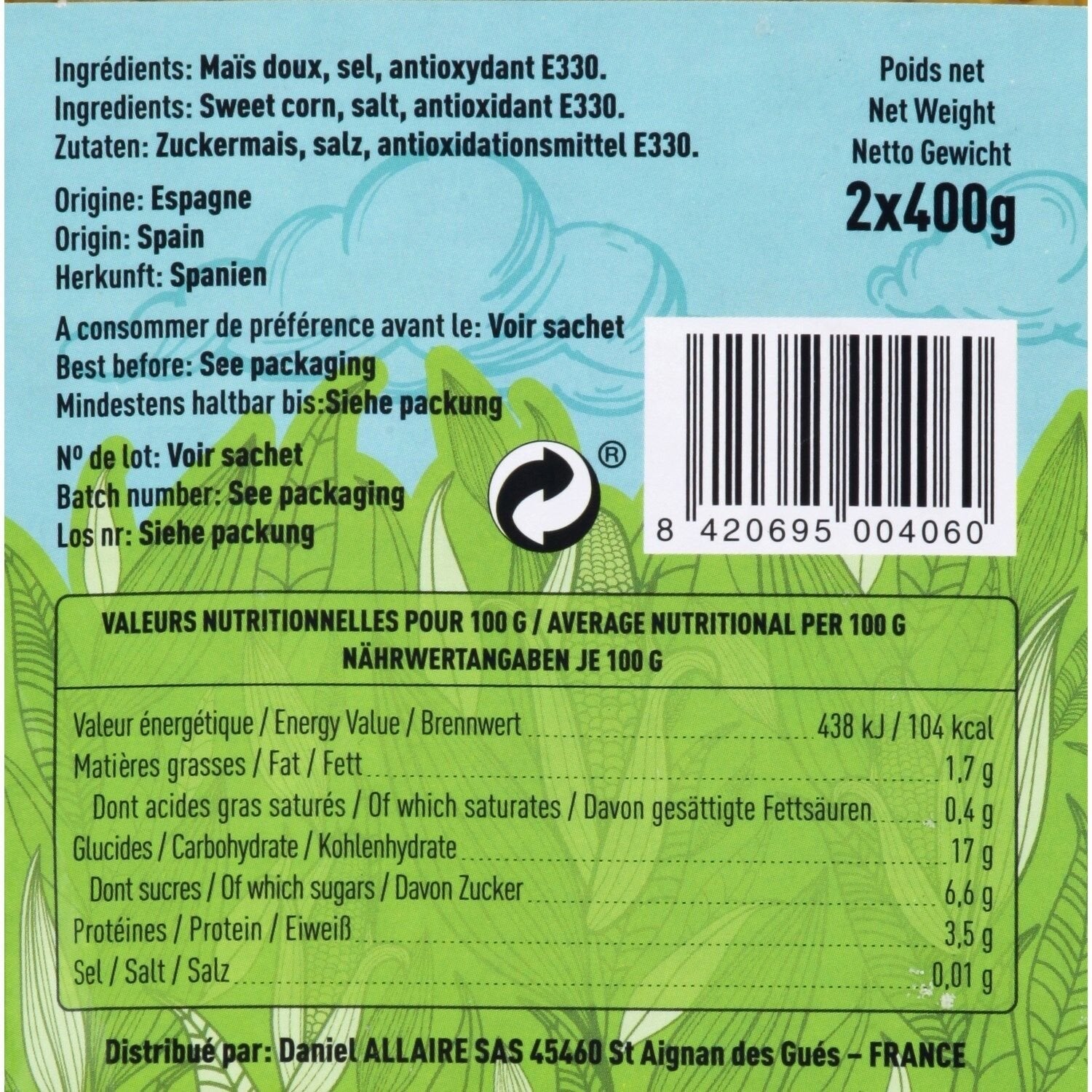 Sweet corn, salt, antioxidant E330. Origin: Spain.
