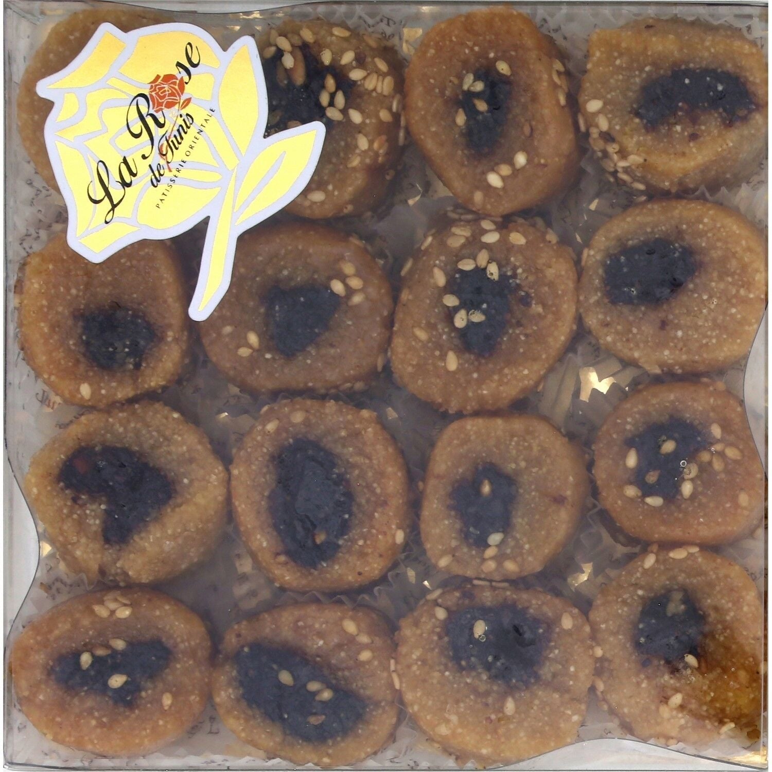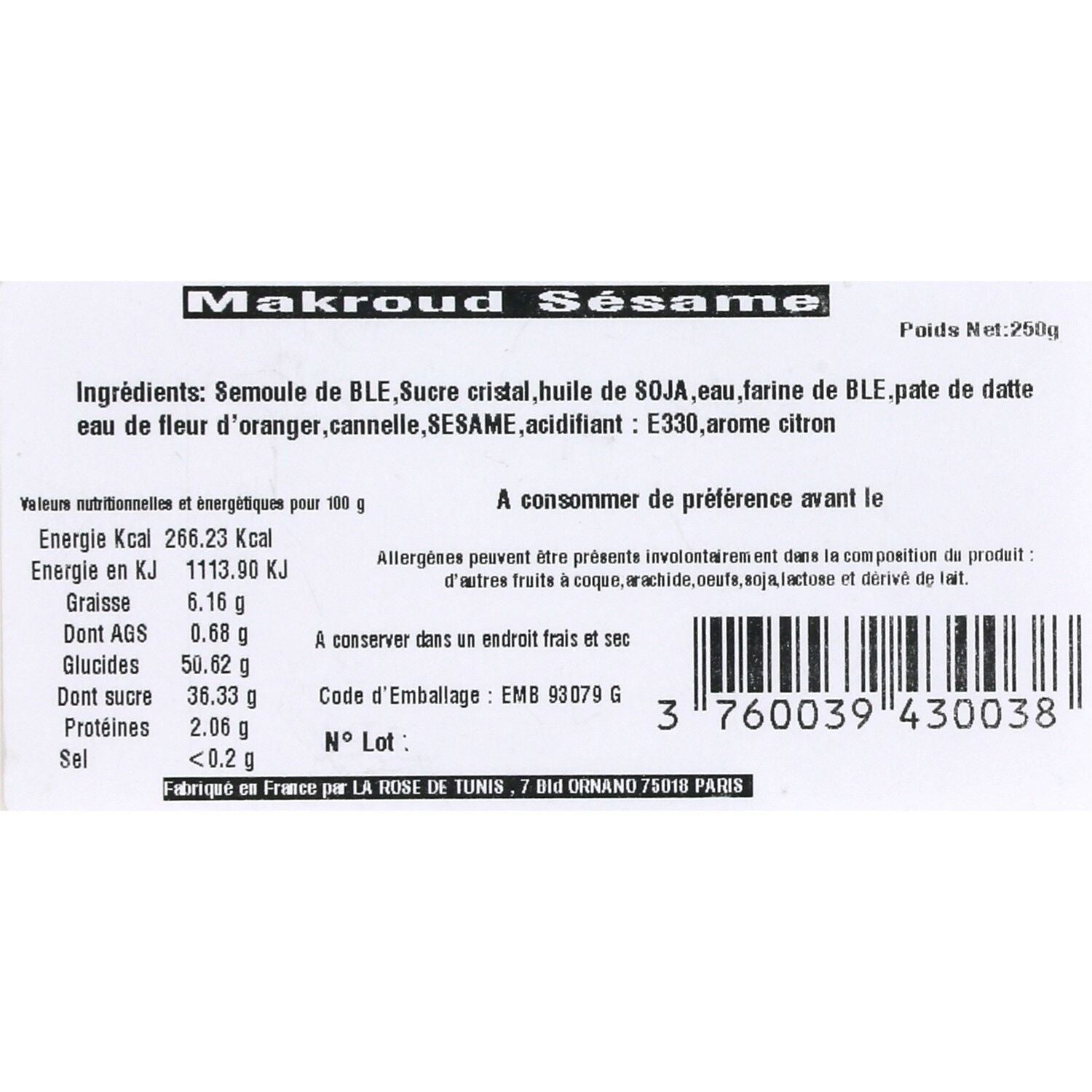 WHEAT semolina, crystal sugar, SOYBEAN oil, water, WHEAT flour, date paste, orange blossom water, cinnamon, SESAME, acidifier: E330, lemon flavoring. Allergens that may be present unintentionally in the composition of the product: other NUTS, PEANUTS, EGGS, SOY, lactose and MILK derivatives. In the case of manufacturing and/or handling in store, staff handle the following allergens in their workshops: Cereals containing GLUTEN - EGG - FISH - PEANUTS - SOY - MILK - NUTS - MUSTARD - SESAME SEEDS - SULFITE. We cannot also exclude the contamination of raw materials with LUPIN and CELERY.