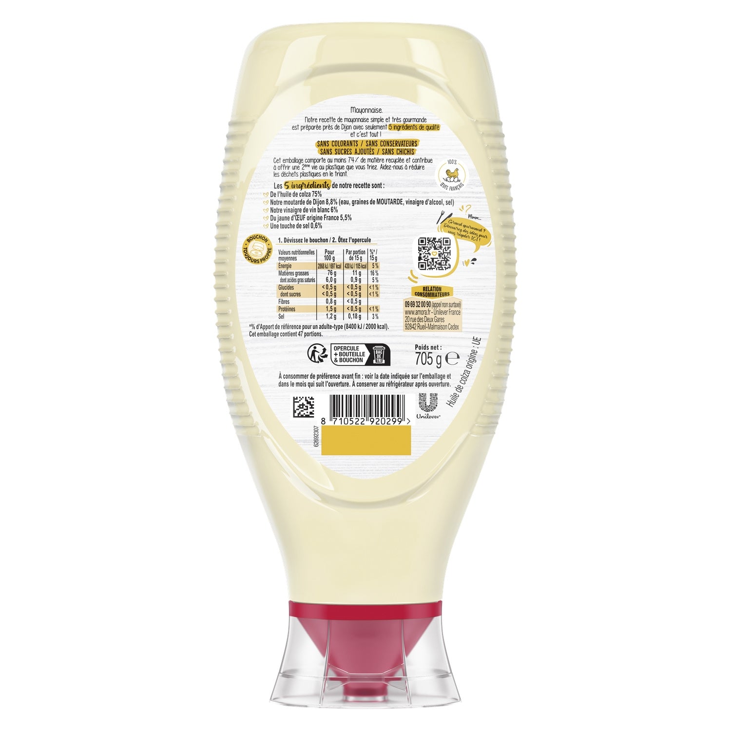 Amora Dijon Mayonnaise: a simple and delicious recipe prepared in Dijon with 5 selected ingredients, a little love and that's it!,5 quality ingredients: 100% French eggs, rapeseed oil, our Dijon mustard, our white wine vinegar and a touch of salt. And, that's it!,Share the best: a no-fuss recipe, no colorings, no added sugars and rapeseed oil, rich in Omega 3.,Mayonnaise to delight the whole family: a Dijon Mayonnaise recipe with an authentic taste and a creamy texture.,The packaging of our mayonnaise contains at least 74% recycled plastic, practical with a cap that is always clean.,With Amora ® mayonnaise, share more than just a meal!