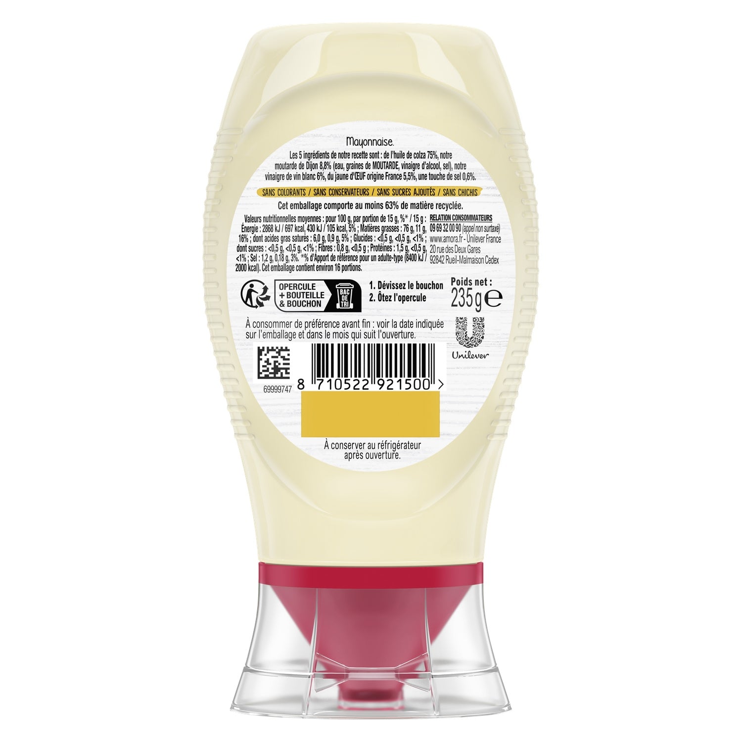 Amora Dijon Mayonnaise: a simple and delicious recipe prepared in Dijon with 5 selected ingredients, a little love and that's it!,5 quality ingredients: 100% French eggs, rapeseed oil, our Dijon mustard, our white wine vinegar and a touch of salt. And, that's it!,Share the best: a no-fuss recipe, no colorings, no added sugars and rapeseed oil, rich in Omega 3.,Mayonnaise to delight the whole family: a Dijon Mayonnaise recipe with an authentic taste and a creamy texture.,The packaging of our mayonnaise contains at least 63% recycled plastic, practical with a cap that is always clean.,With Amora ® mayonnaise, share more than just a meal!