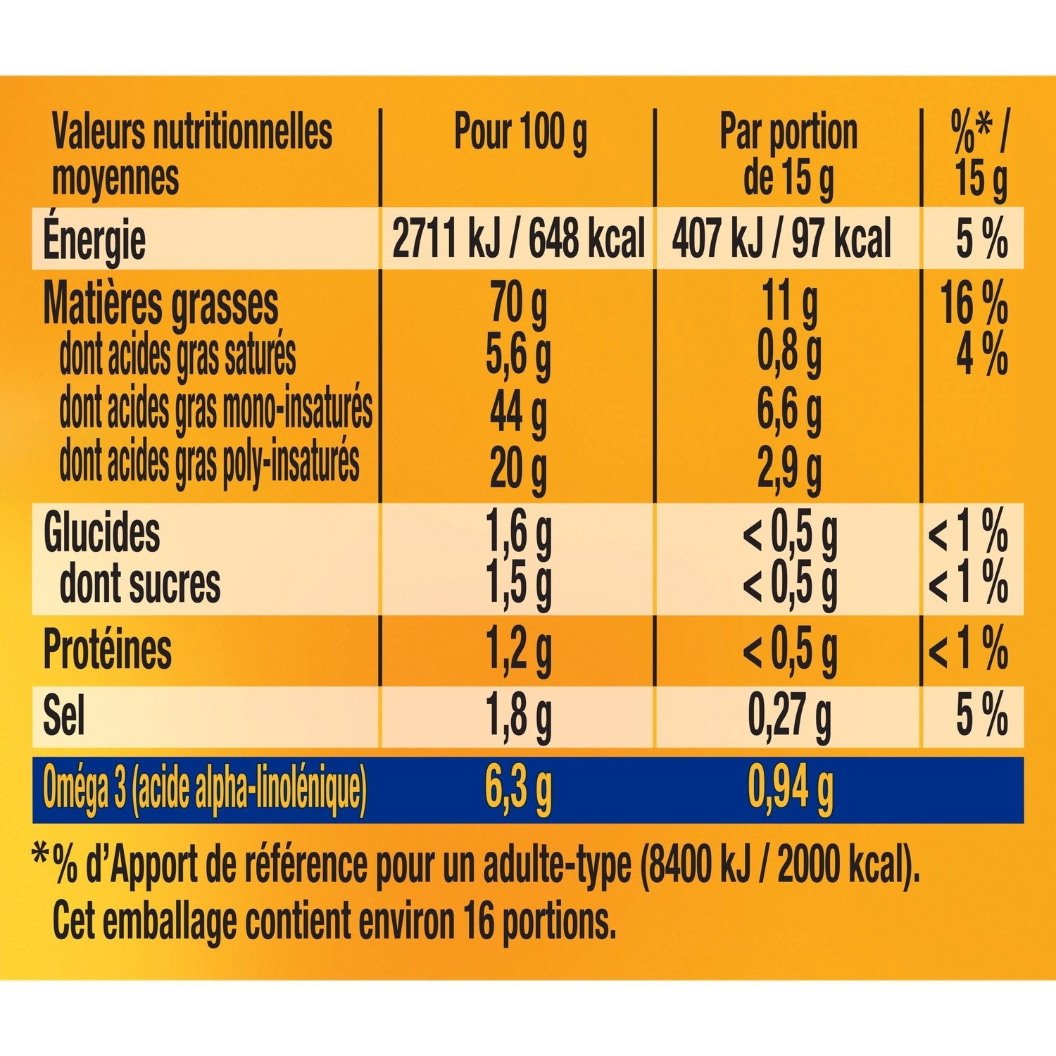 Energy value (kJ): 2711 kJ / 100 g | Energy value (kcal): 407 kcal / 100 g | Fat: 70 g / 100 g | Saturated fatty acids: 5.6 g / 100 g