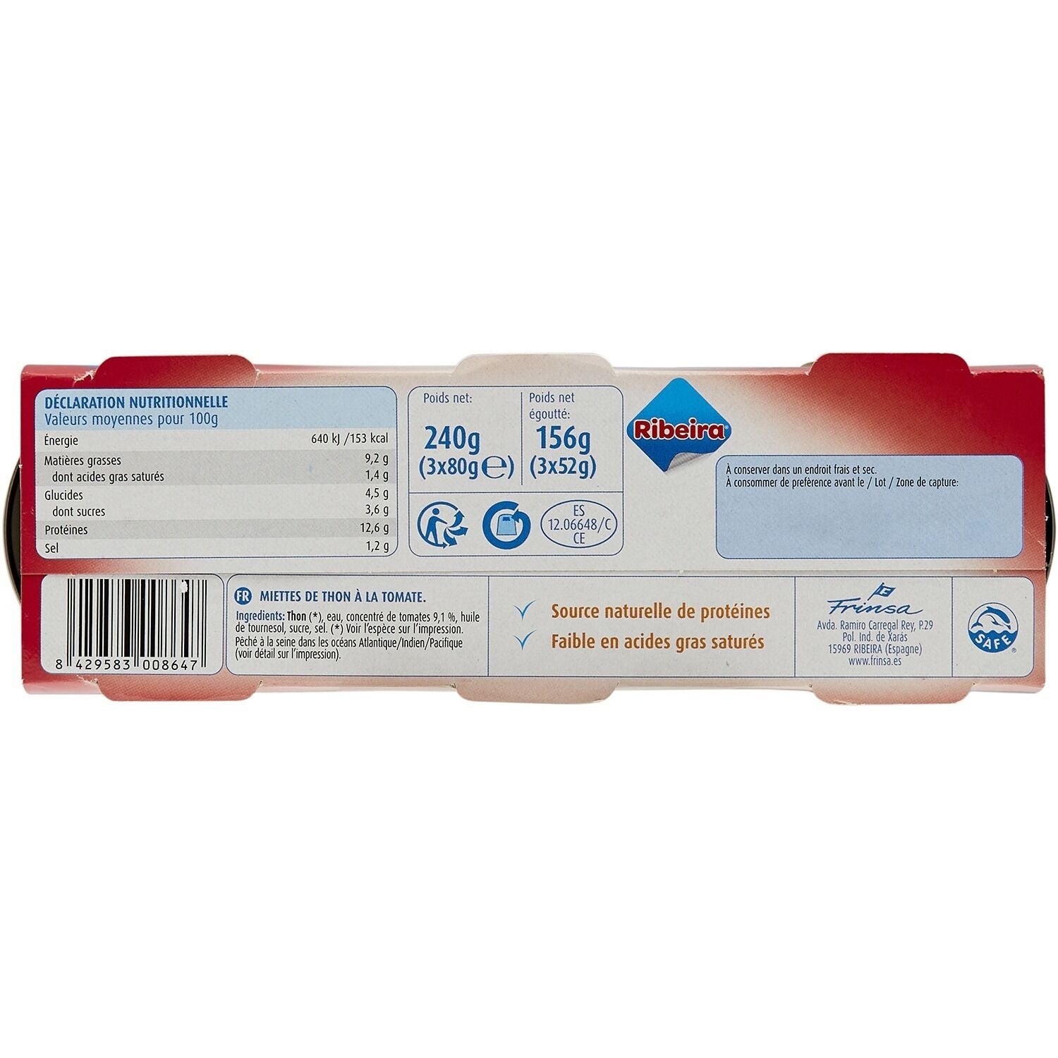 TUNA, water, tomato paste 9.1%, sunflower oil, sugar, salt. Seine-fished in the Atlantic/Indian/Pacific Oceans.