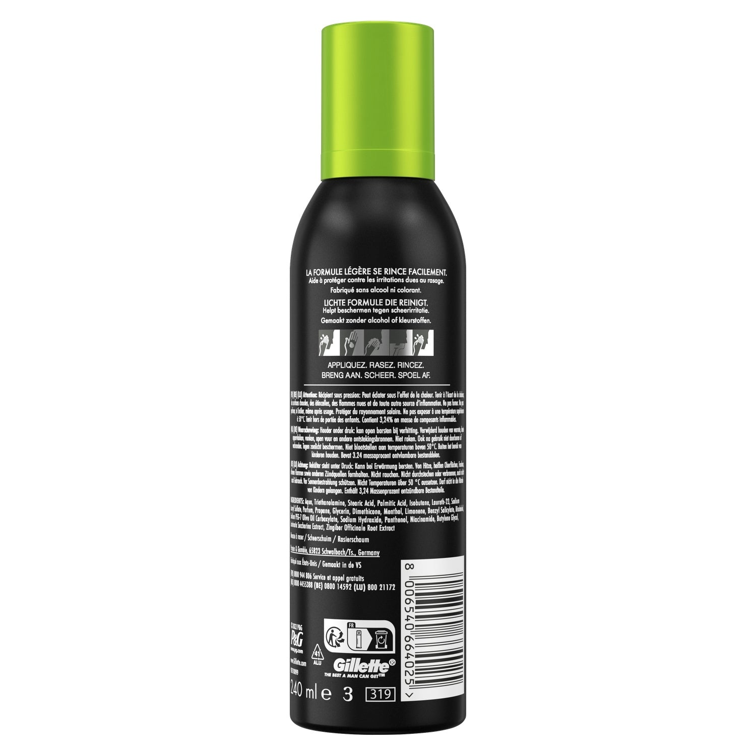 Aqua, Triethanolamine, Stearic Acid, Palmitic Acid, Isobutane, Laureth-23, Sodium Lauryl Sulfate, Parfum, Propane, Glycerin, Dimethicone, Menthol, Limonene, Benzyl Salicylate, Bisabolol, Sodium PEG-7 Olive Oil Carboxylate, Sodium Hydroxide, Panthenol, Niacinamide, Butylene Glycol, Laminaria Saccharina Extract, Zingiber Officinale Root Extract