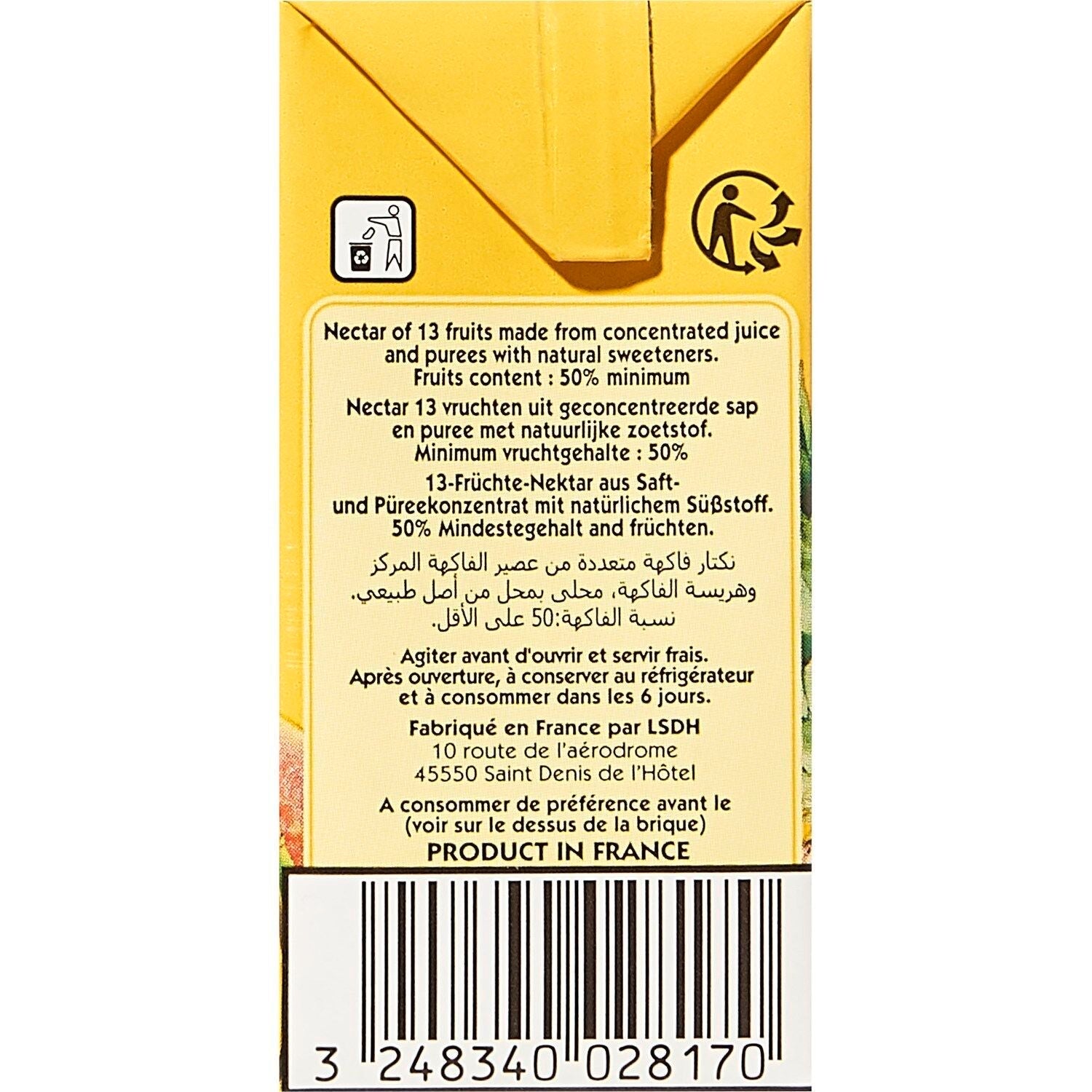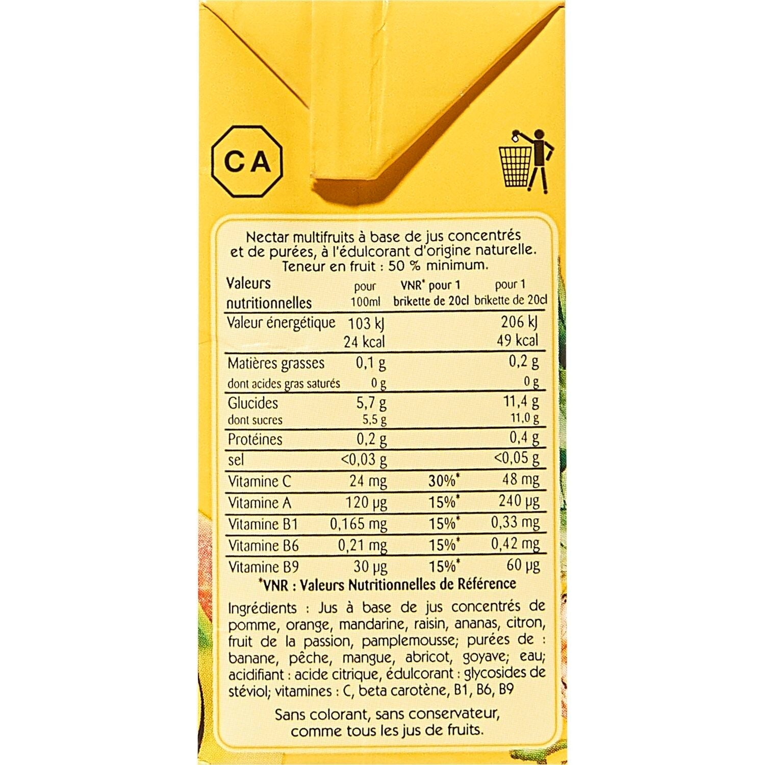 Multi-fruit nectar made from concentrated juices and purees, with natural sweetener. Fruit content: 50% minimum.