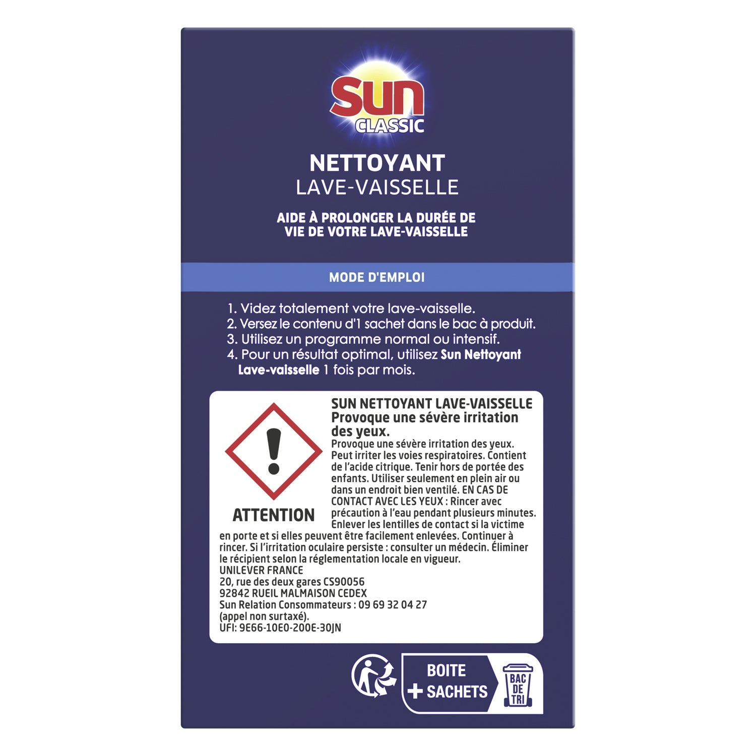 New design, same efficiency: Sun Classic provides long-lasting maintenance for your machine with our dishwasher cleaner.,Our triple action dishwasher cleaner cleans, refreshes, removes limescale and degreases your dishwasher thanks to its triple action formula.,For optimal results and perfect maintenance, we recommend using one dose of Sun Nettoyant Machine Classic dishwasher product once a month.,Instructions for use: completely empty your dishwasher, pour the contents of one sachet of Sun Nettoyant Machine Classic into the detergent drawer, use a normal or intensive program,Sun Nettoyant Machine Classic cleans the filter, spray arms and pipes of your dishwasher, for improved hygiene every day.,Since its beginnings in 1965, Sun has continued to dedicate itself to innovation by creating products that help you take care of your dishes and your dishwasher.