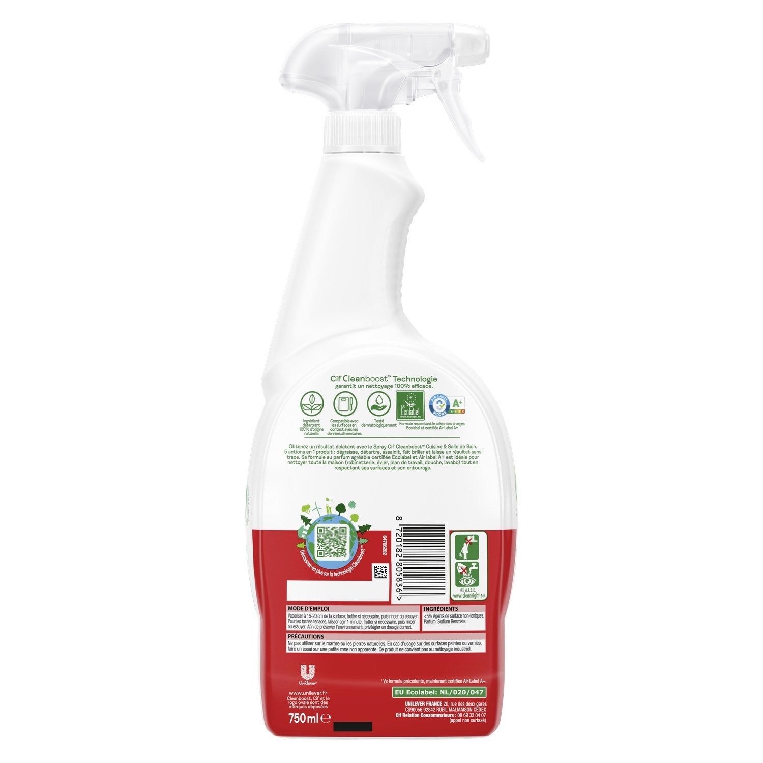 The Cif 5-in-1 Kitchen & Bathroom spray gun cleaner is ideal for everyday cleaning: it degreases, descales, sanitizes, shines and leaves no traces.,This Bathroom & Kitchen cleaner is your best ally for maintaining impeccable hygiene and a sparkling result effortlessly.,This multi-purpose disinfectant spray is effective throughout your home: taps, stove, sink, shower and washbasin.,The 5-in-1 cleaning spray guarantees cleanliness and shine without streaks on all surfaces in your home, while delicately perfuming them.,Dermatologically tested and Airlabel A+ certified, the Cif multi-purpose cleaner makes cleaning your home easier and helps take care of your family by keeping your home clean and healthy.,Cif is committed to the planet by offering an effective multi-purpose cleaner while respecting the Ecolabel specifications.