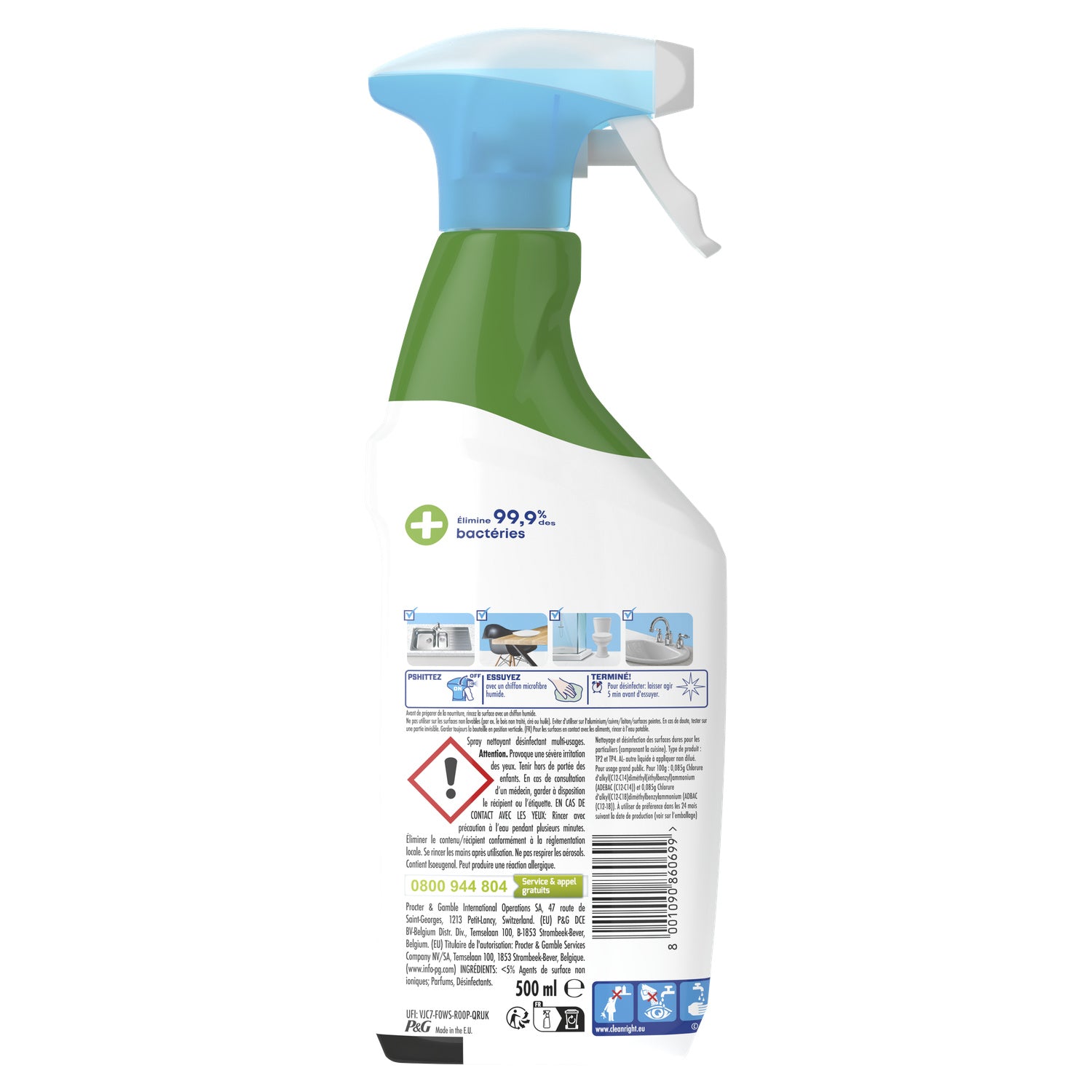 To disinfect: Leave on for 5 minutes before wiping. Before preparing food, rinse the surface with a damp cloth. For surfaces in contact with food, rinse with potable water.
