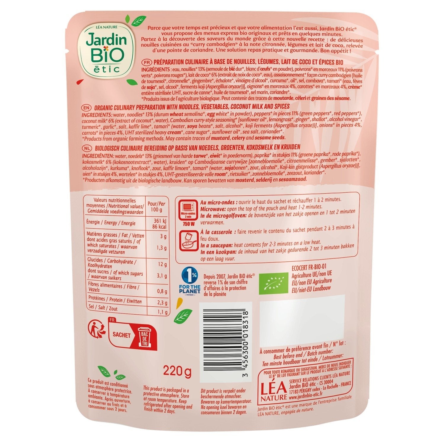 Noodles cooked with Cambodian curry, vegetables and coconut milk Cooked in our organic cannery in France 1% for the planet
