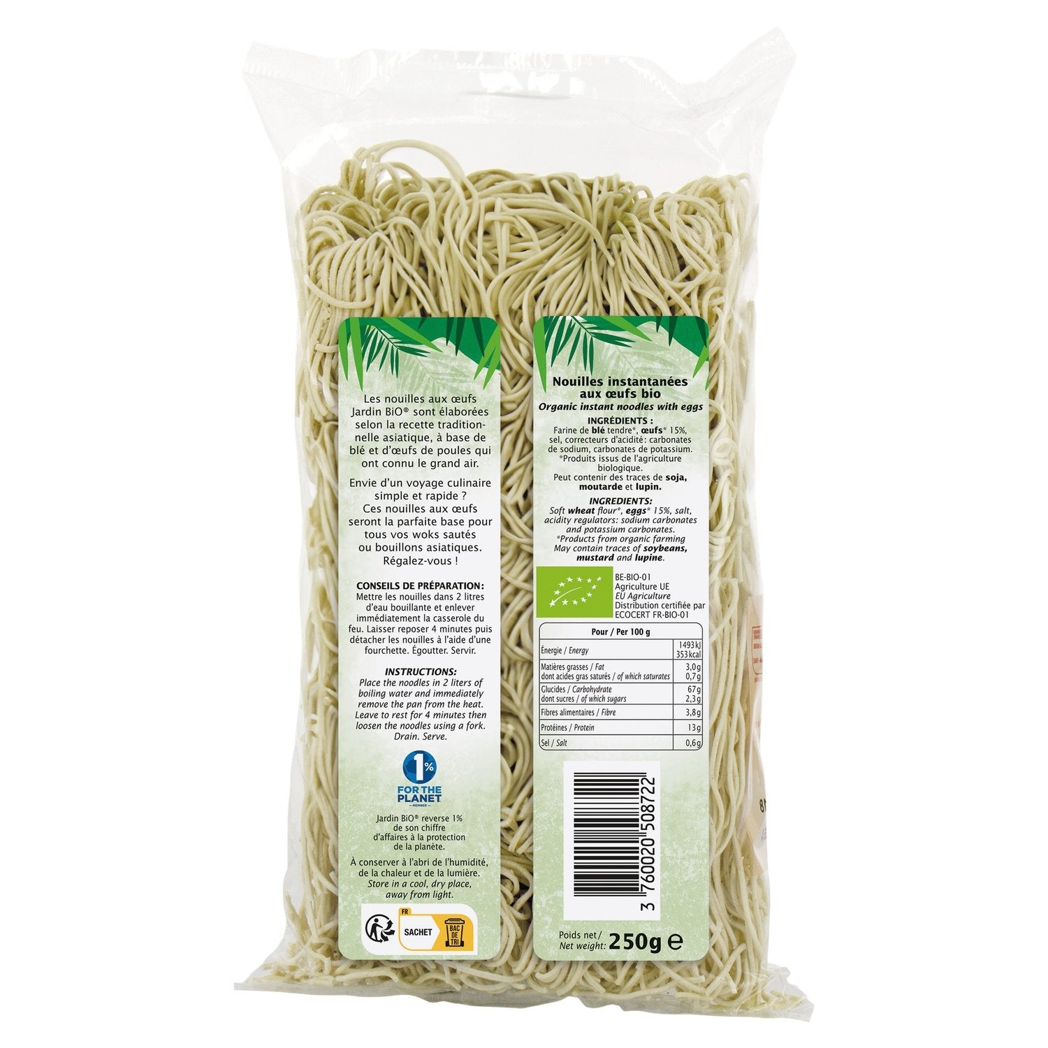 Jardin Bio® egg noodles are made according to a traditional Asian recipe, using wheat and eggs from free-range chickens. Looking for a quick and easy culinary journey? These egg noodles are the perfect base for all your stir-fries or Asian broths. Enjoy! Free-range chickens 1% for the planet Organic Source of protein Quick cooking time 4 min