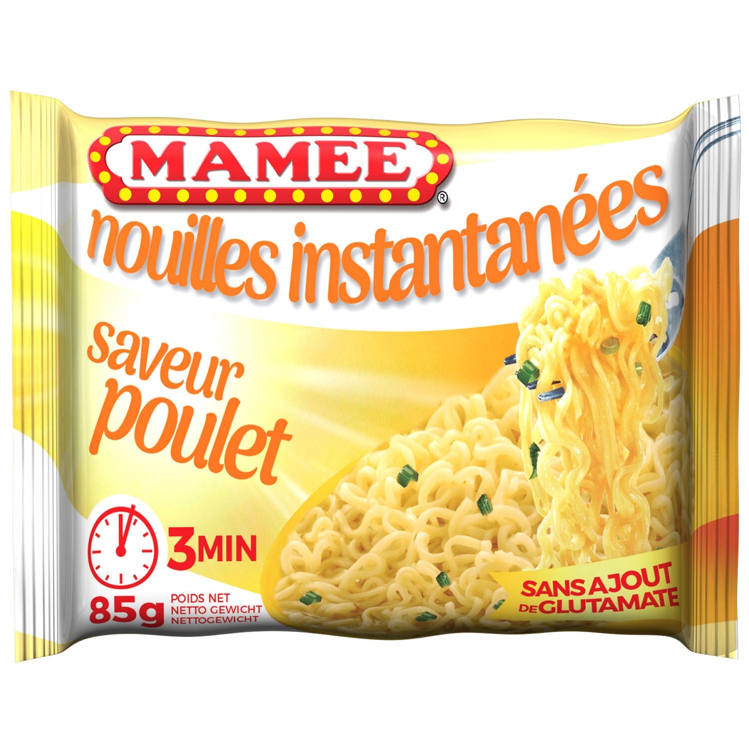 Tasty instant noodles ready in 3 minutes, MSG-free, chicken flavor.