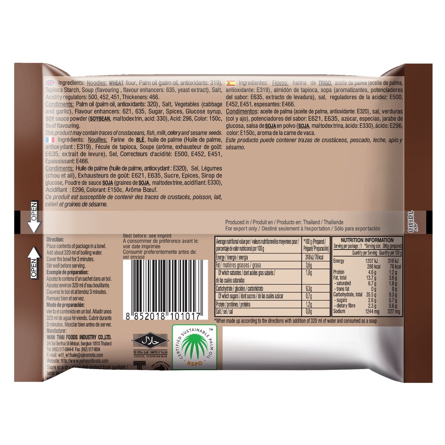Ingredients: INGREDIENTS: NOODLES: WHEAT FLOUR, PALM OIL (CONTAINS ANTIOXIDANTS: E319), TAPIOCA STARCH, SOUP (FLAVOURING, FLAVOUR ENHANCER E627, E 631), YEAST EXTRACT, SALT, ACIDITY REGULATOR: E500, E452, E451, THICKENER: E466. CONDIMENTS: PALM OIL (CONTAINS ANTIOXIDANTS: E320), SALT, VEGETABLES (CABBAGE AND GARLIC), FLAVOUR ENHANCER: E621, E627, E631, SUGAR, EP…