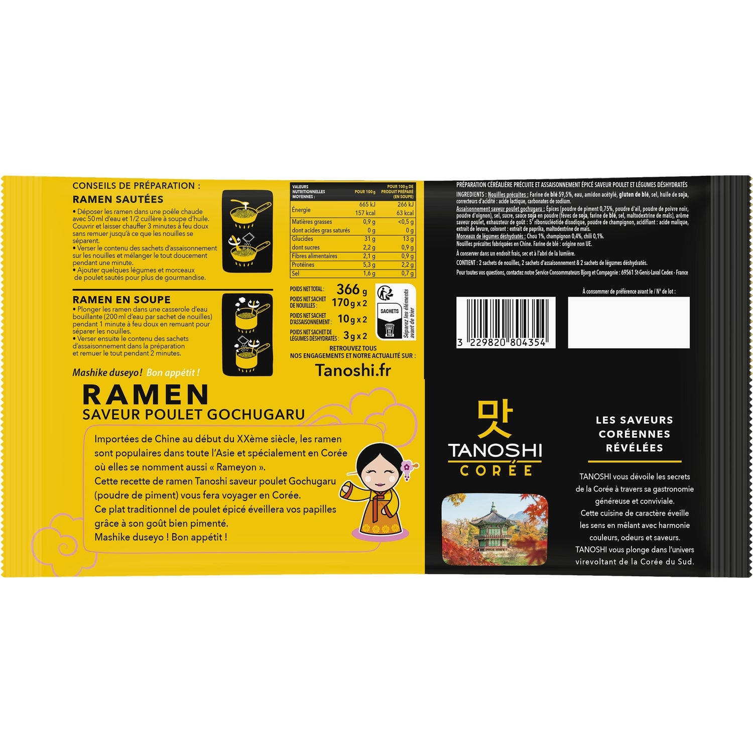 Discover Tanoshi Gochugaru Chicken Ramen and add Korean cuisine to your daily routine. Ready in just 4 minutes, stir-fried or in soup, for 2 people, and palm oil-free, these spicy noodles will help you (re)discover the flavors of Korea.