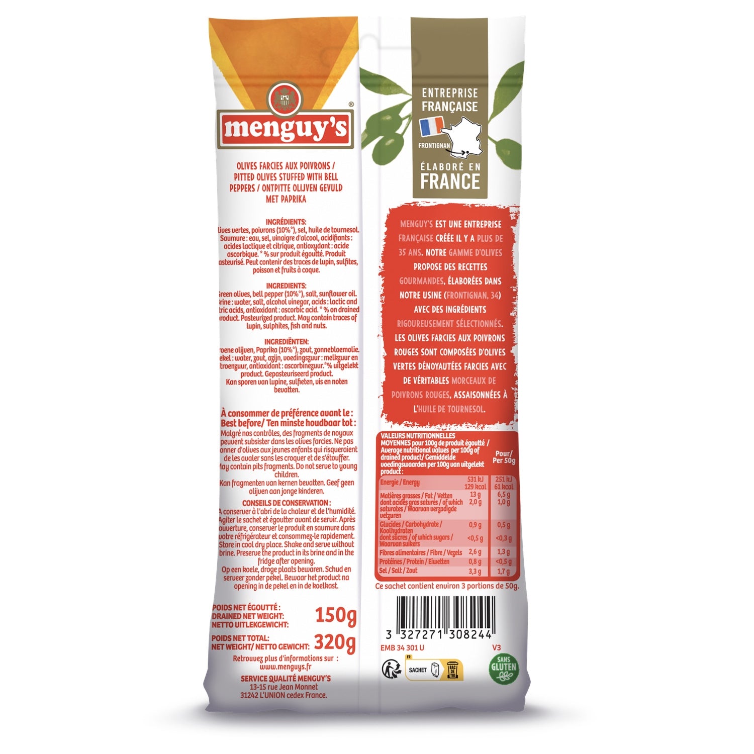 Carefully selected, fleshy green olives stuffed with real pieces of red pepper. Produced in France at our factory (Frontignan, 34). No added flavorings or flavor enhancers.