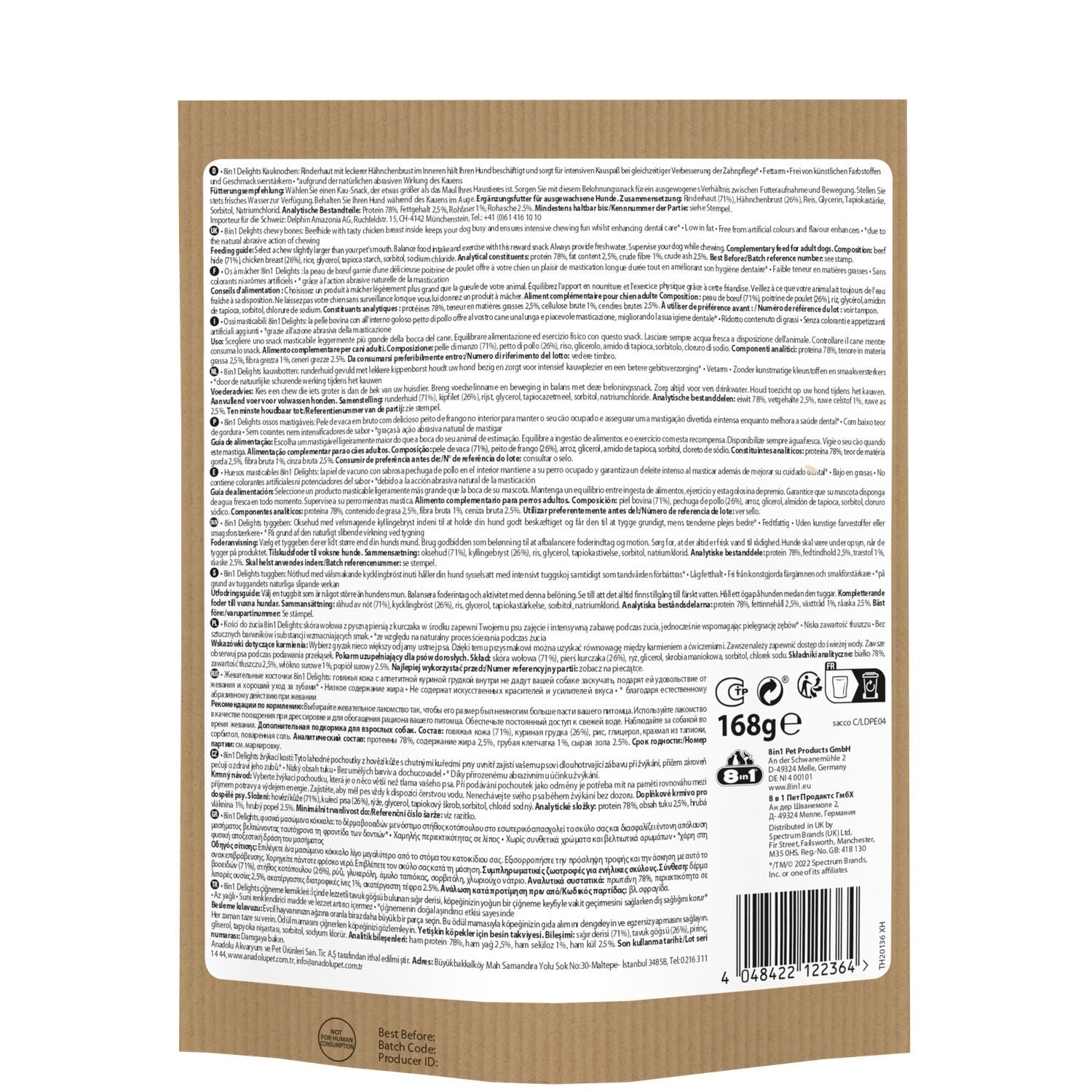 Complementary food for dogs. Features of 8in1 Delights Chicken Dog Chew Bones: - New improved recipe - 100% natural - No artificial colors or flavor enhancers - Unique chew treats with tasty pieces of meat - High chicken meat content, rolled in several layers with firm beef skin - Awakens the natural chewing instinct - Available in several sizes suitable for every type of dog - Good for teeth and gums - Long-lasting pleasure - Eaten in one sitting, no leftovers Animal food - not intended for human consumption.