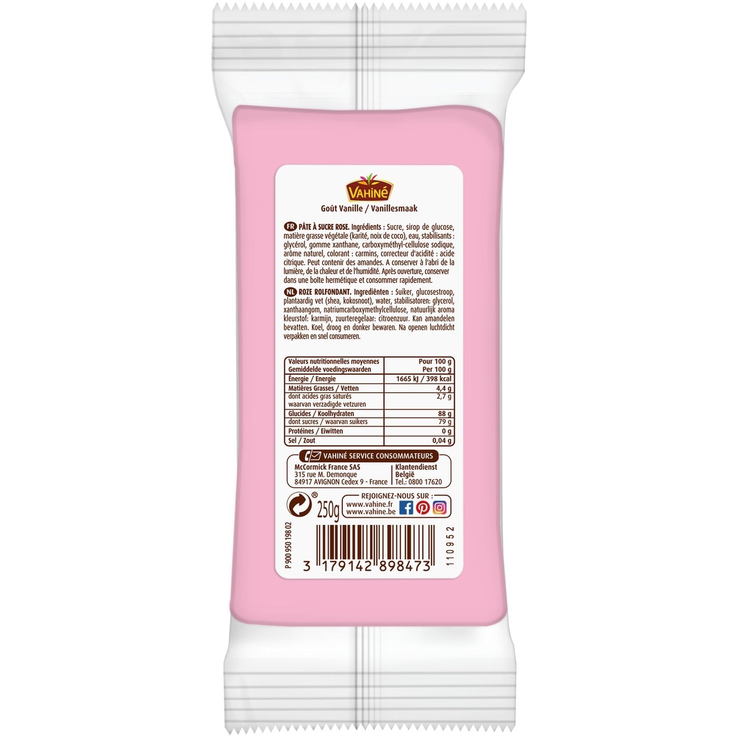 Vahiné pink sugar paste, with its natural aroma, is ideal for easily decorating all your desserts. With its delicious vanilla flavor, it goes well with all cakes. Ready to use, this pink sugar paste is soft and elastic, does not stick and can easily cover your cakes, shape your decorations or even be cut with cookie cutters. Easy and practical!