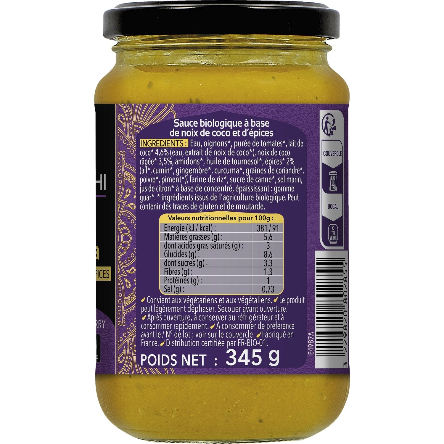 Water, onions*, tomato puree*, coconut MILK* 4.6% (water, coconut extract*), grated coconut* 3.5%, starches*, sunflower oil*, spices* 2% (garlic*, cumin*, ginger*, turmeric*, coriander seeds*, pepper*, chili*), rice flour*, cane sugar*, sea salt, lemon juice* from concentrate, thickener: guar gum*./ May contain traces of GLUTEN and MUSTARD…