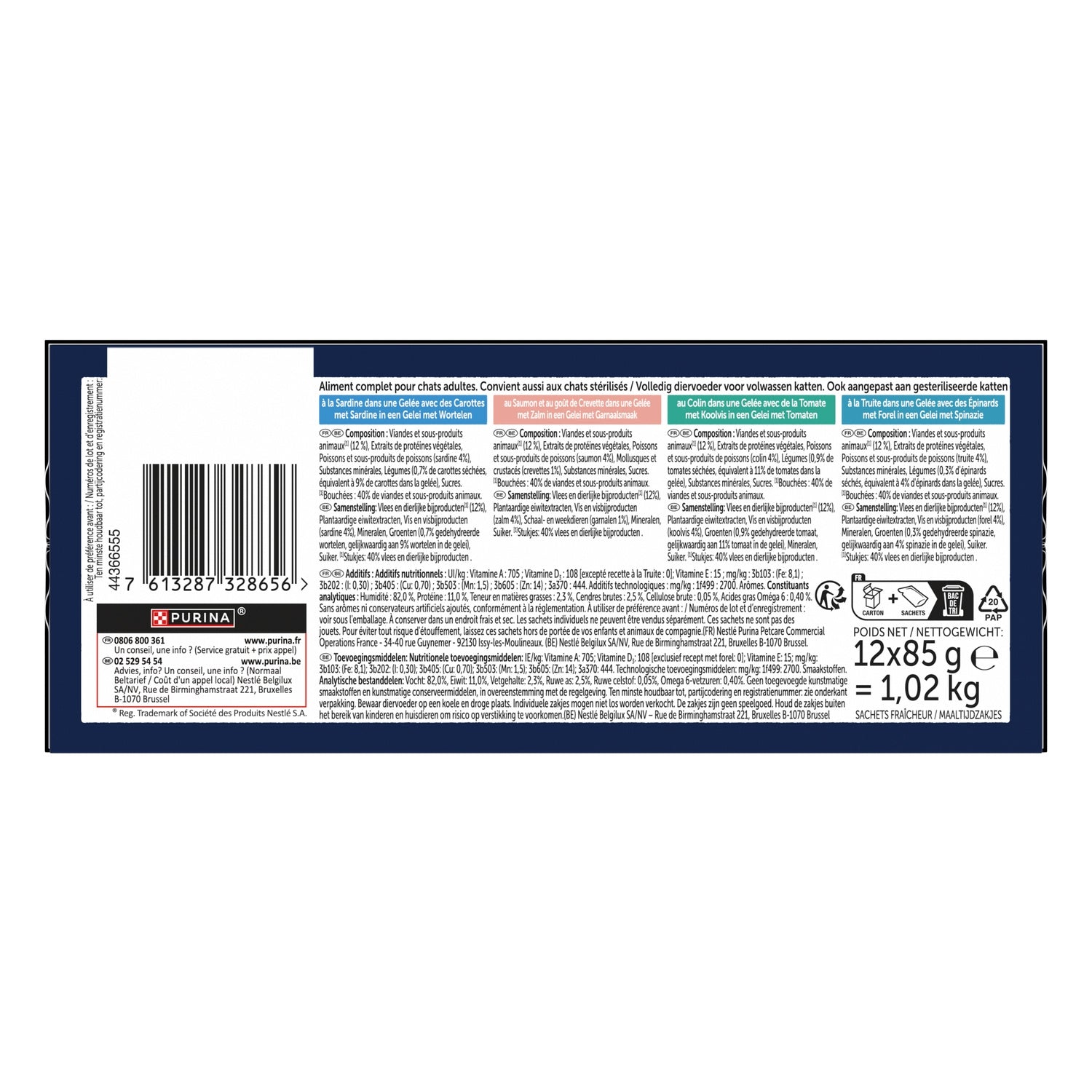 Composition: Meat and animal by-products (12%), Vegetable protein extracts, FISH and FISH by-products (trout 4%), Minerals, Vegetables (0.3% dried spinach, equivalent to 4% spinach in jelly), Sugars. Bites: 40% meat and animal by-products. Composition: Meat and animal by-products (12%), Vegetable protein extracts, FISH and FISH by-products (sardine 4%), Minerals, Vegetables (0.7% dried carrots, equivalent to 9% carrots in jelly), Sugars. Bites: 40% meat and animal by-products. Composition: Meat and animal by-products (12%), Vegetable protein extracts, FISH and FISH by-products (pollock 4%), Vegetables (0.9% dried tomatoes, equivalent to 11% tomatoes in jelly), Minerals, Sugars. Bites: 40% meat and animal by-products. Composition: Meat and animal by-products (12%), Vegetable protein extracts, FISH and FISH by-products (salmon 4%), Molluscs and crustaceans (shrimp 1%), Minerals, Sugars. Bites: 40% meat and animal by-products.