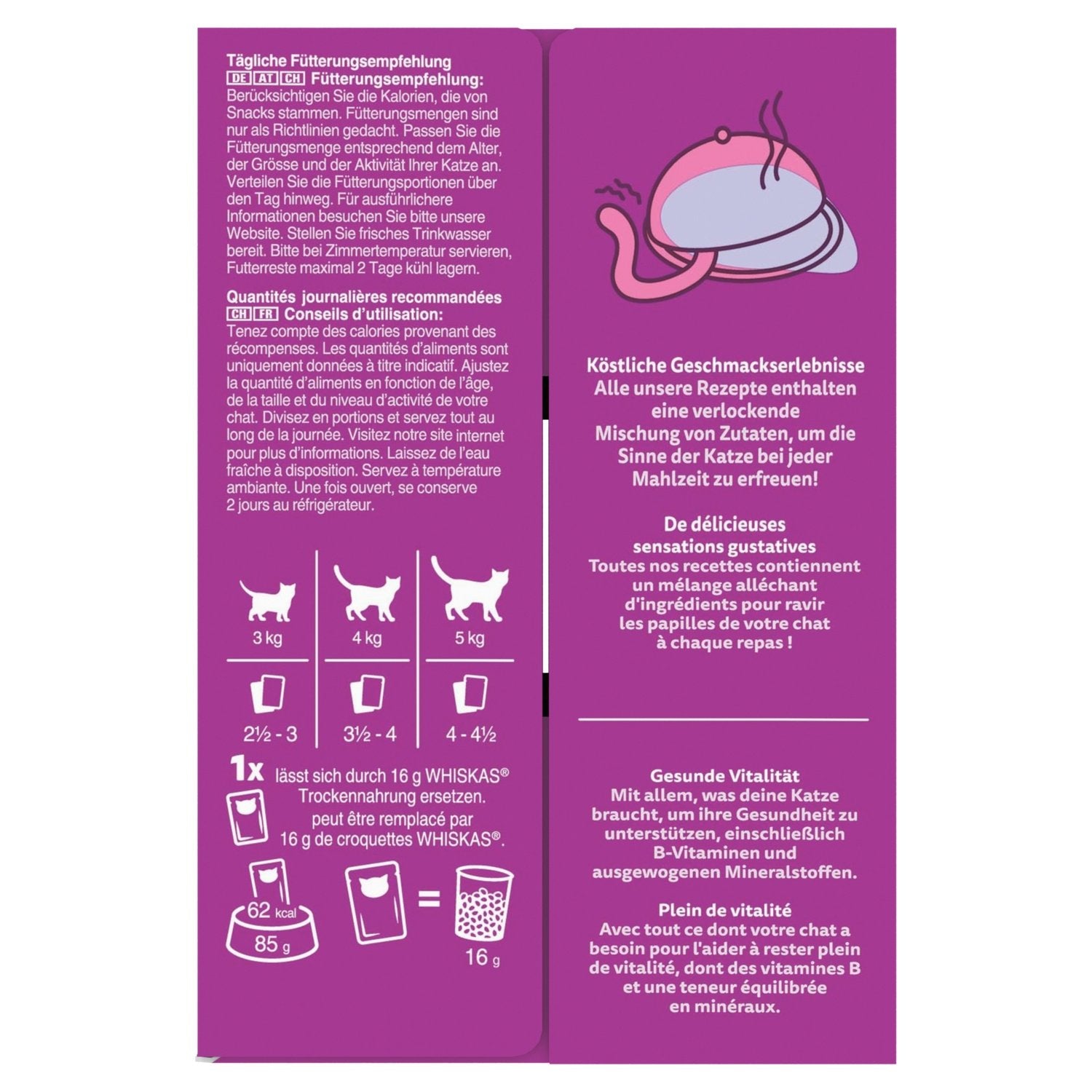 Complete wet food for adult cats - 4 varieties Ocean delights in jelly. Fresh pouches also suitable for neutered cats. With Whiskas® Duo Fresh Pouches, we help you feed your cat at every stage of their life, with meals they'll instinctively love and that cover 100% of your cat's daily needs. Our range of WHISKAS® Fresh Pouches offers delicious taste sensations to delight your cat's taste buds. All our recipes contain a tempting blend of ingredients with everything your cat needs to help them stay full of vitality, including B vitamins and a balanced mineral content. When it comes to nutrition, we believe your cat naturally knows what they like. That's why at Whiskas®, we put all our passion and expertise into selecting our ingredients and developing varied recipes. So every Whiskas® meal gives your cat the flavors they love and all the goodness they need. Cat food developed with nutritionists and veterinarians at the WALTHAM® Research Center - the world's leading authority on pet nutrition and well-being.