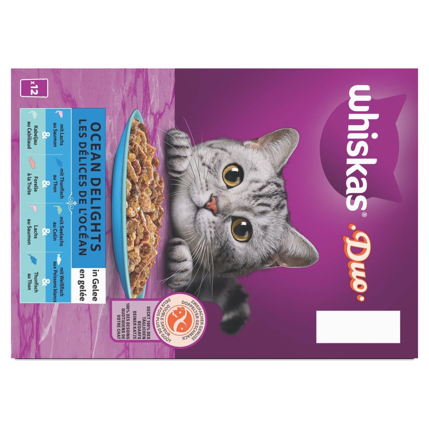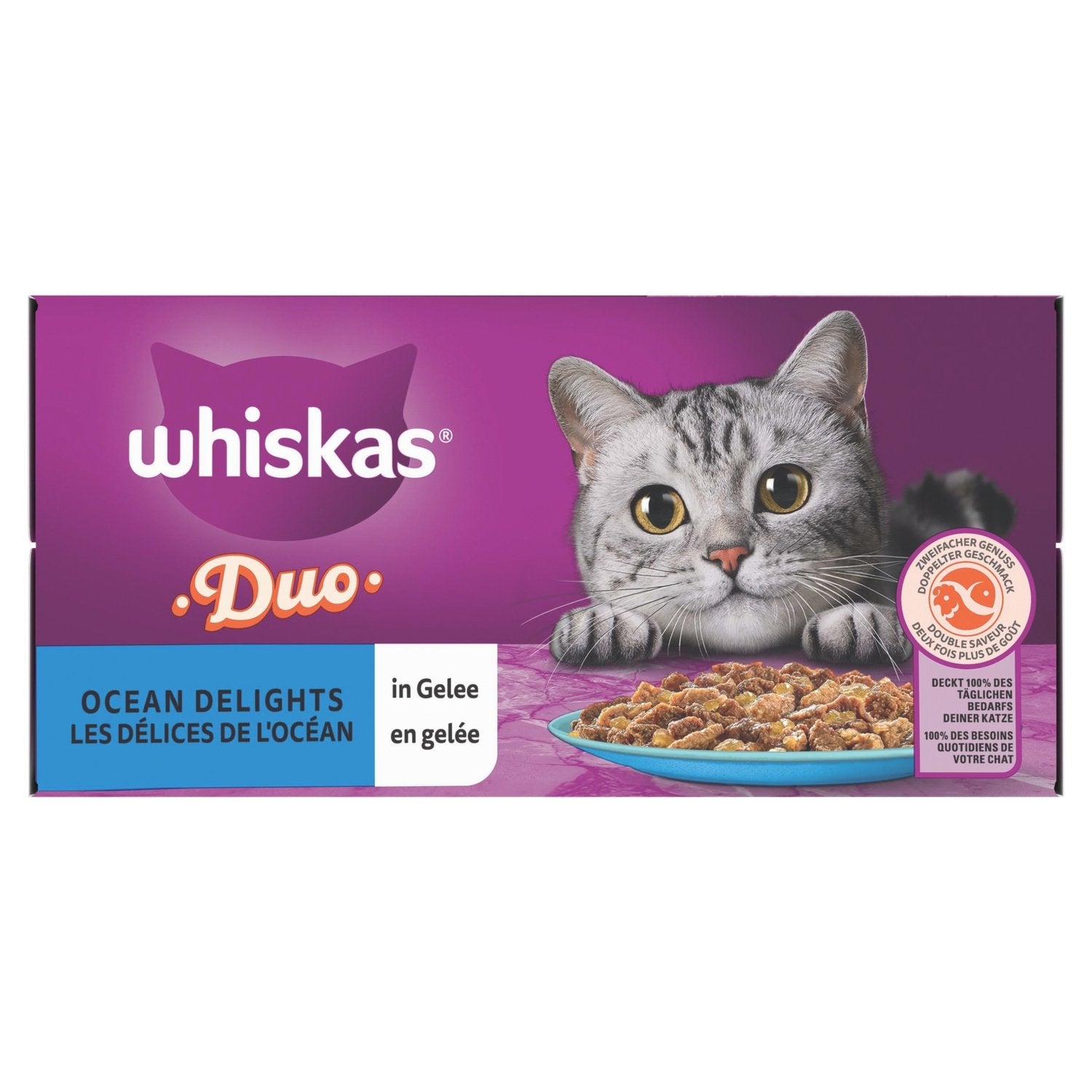 WHISKAS Duo Freshness sachets Ocean Delights in jelly 4 varieties for adult cats are available in 12x85g format