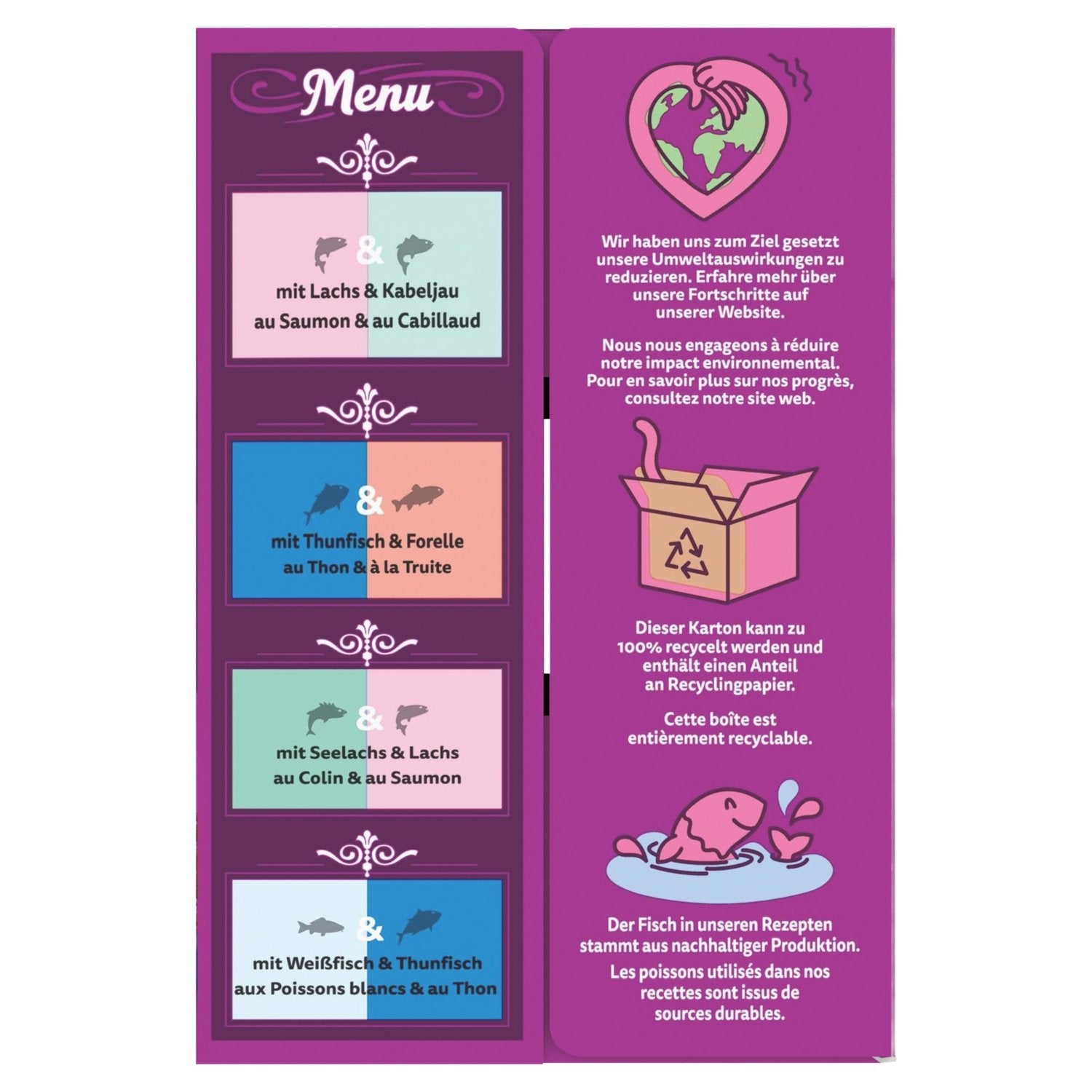 • Complete and balanced wet food for adult cats with 100% of your cat's daily needs • Double flavor for twice the taste • Made with quality ingredients including B vitamins and minerals to help your cat stay full of vitality • The fish used in our recipes are sustainably sourced • Fully recyclable packaging