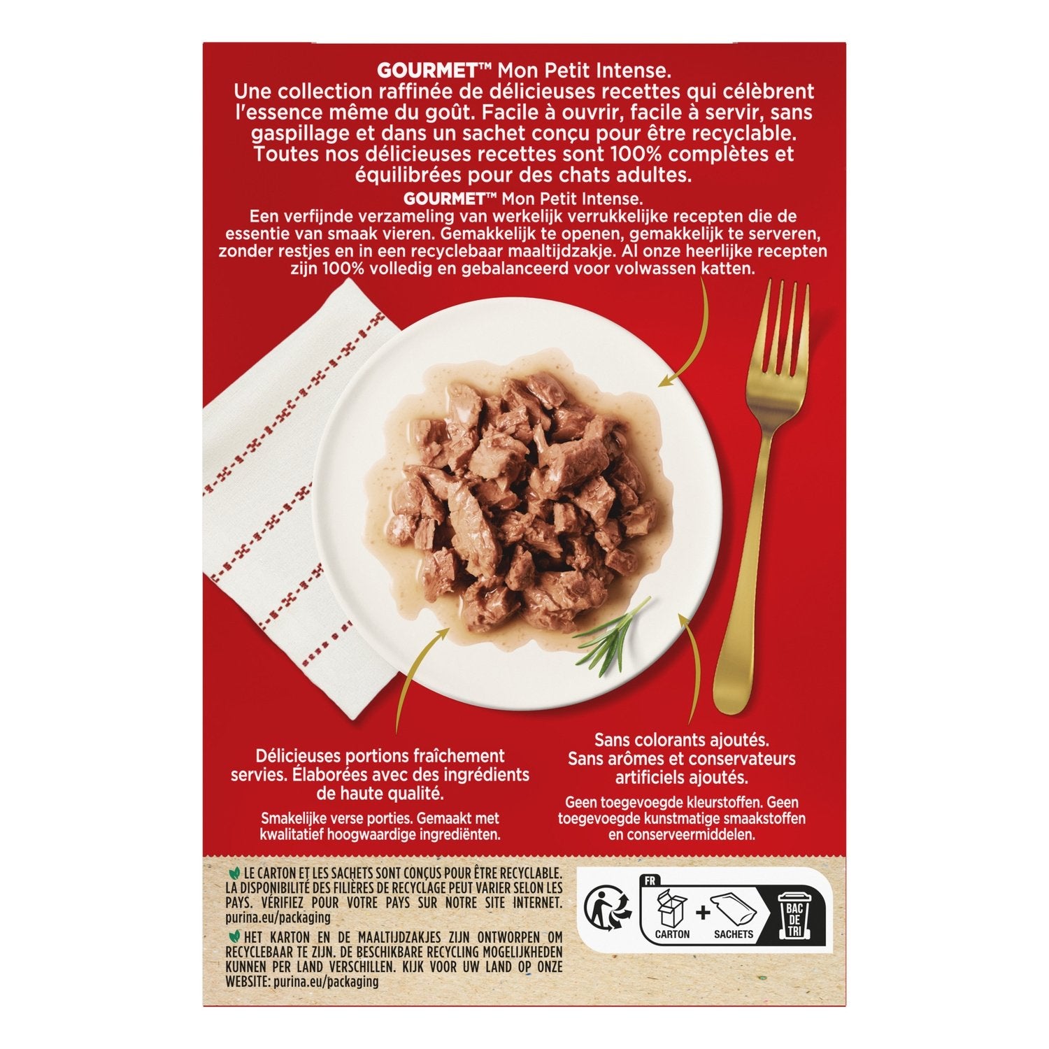 Complete food for adult cats,In a delicious sauce,Delicious portions freshly served,No added colors. No added artificial flavors or preservatives.,Made with high-quality ingredients,Designed to be recyclable,Discover the delicious world of GOURMET MON PETIT Intense