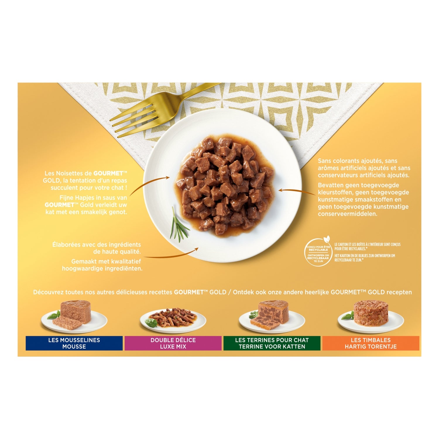 You don't want your cat to get bored of their meals and you always want to surprise them by offering different textures to please them. That's why GOURMET GOLD has created Les Noisettes, delicious recipes that will delight their delicate palate with a different culinary experience every day. These are tender bites of beef, chicken, salmon or other succulent flavors, simmered to perfection. Everything is topped with an appetizing sauce to offer your cat the pleasure of a rich flavor. GOURMET GOLD Les Noisettes, the temptation of a succulent meal for your cat! All GOURMET GOLD recipes are made with high-quality ingredients and are free from added colors, artificial flavors and artificial preservatives.