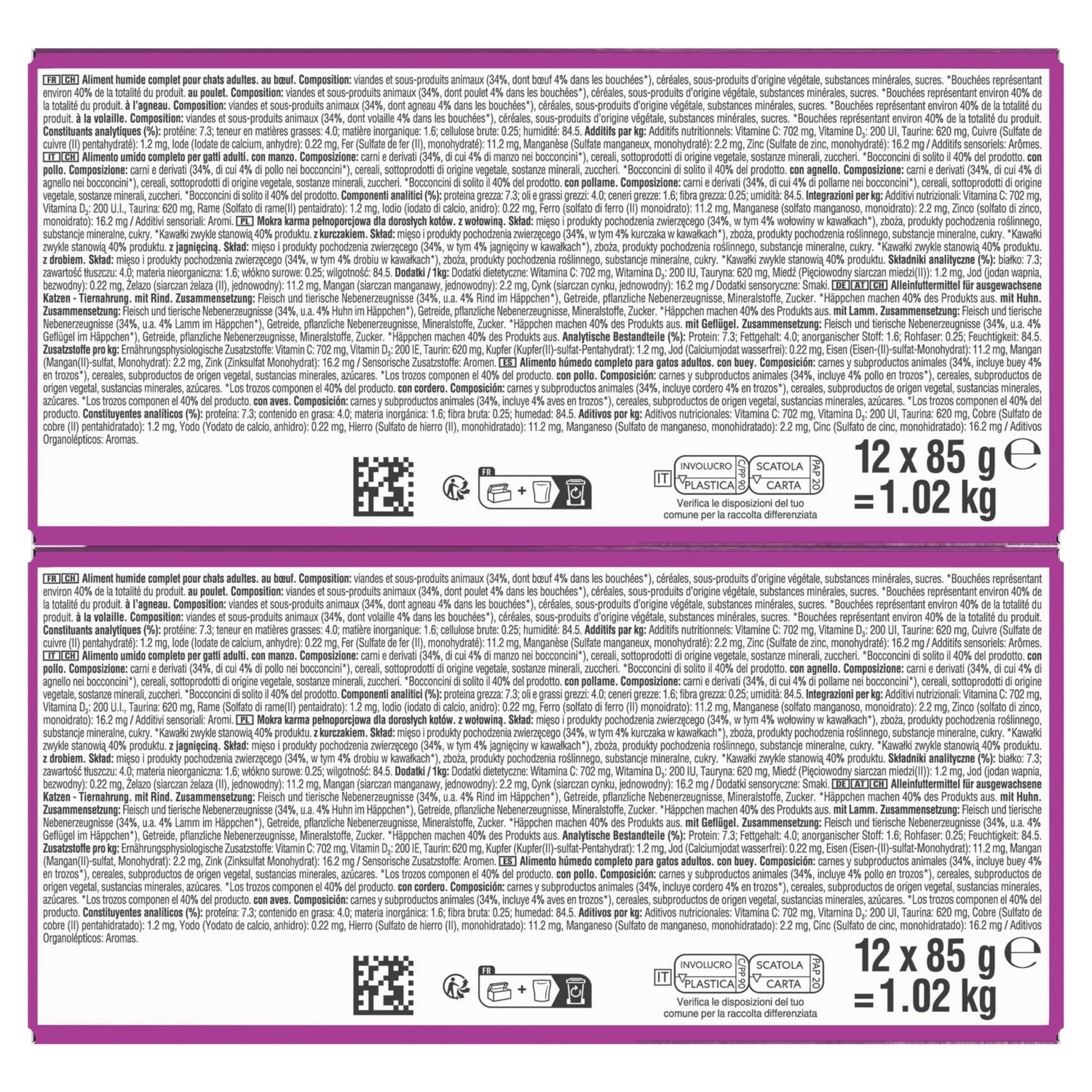 • Complete and balanced meal for adult cats from 1 year old - Suitable for sterilized cats • Cat food prepared in a delicate sauce with high quality ingredients • Irresistible flavors to hear it purr with pleasure (Beef/Chicken/Lamb/Poultry) • Contributes to strong muscles, healthy skin and coat & helps maintain natural defenses • Convenient freshness sachet ideal for a clean bowl without leftovers