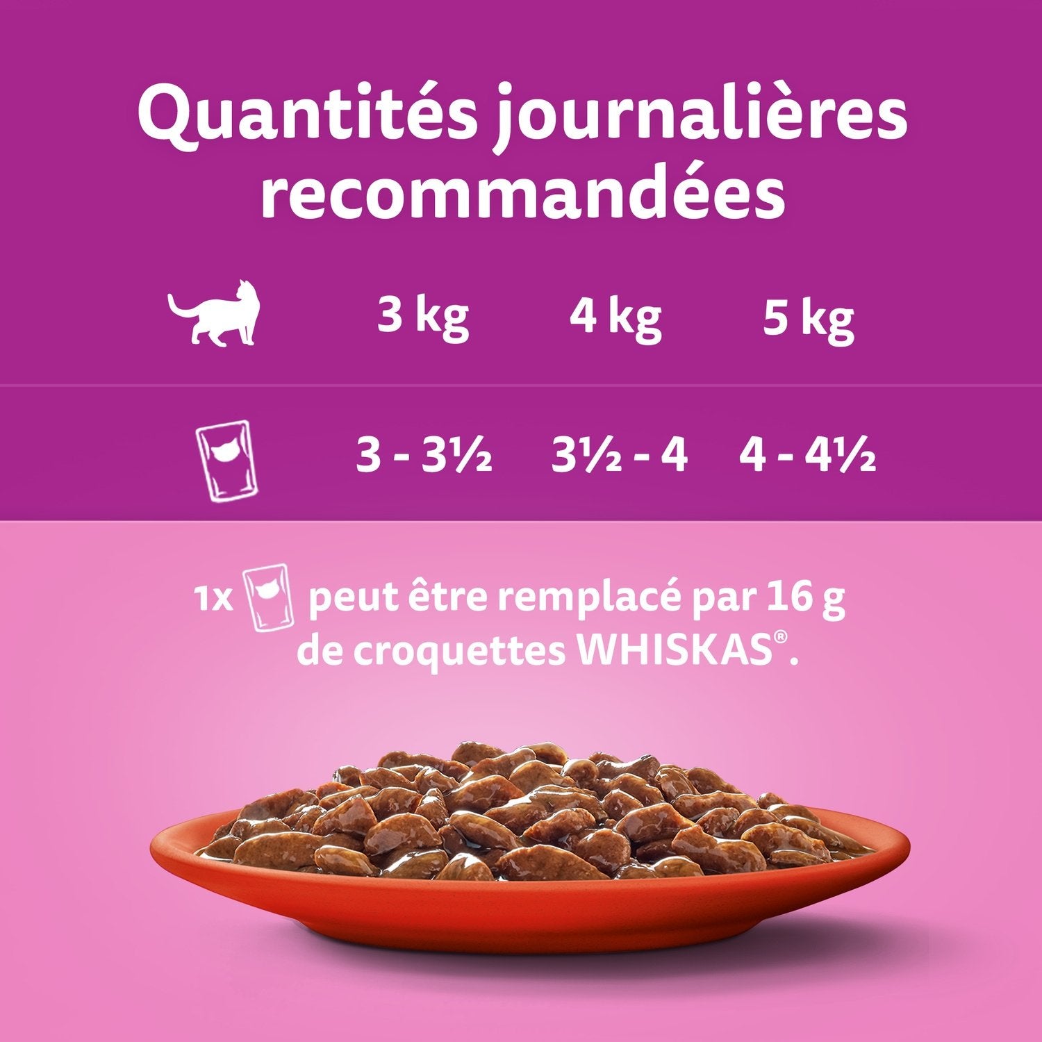 Complete wet food for adult cats from 1 year old - Also suitable for neutered cats - Whiskas® Freshness Pouches Classic Meals in sauce 4 varieties (Beef / Chicken / Lamb / Poultry). Recipes prepared with high-quality ingredients, a delicate texture and an irresistible taste for guaranteed pleasure! Give your cat the flavors they prefer and all the good things they need to vary the pleasures while helping them stay full of vitality and happy. A complete and balanced meal that provides your cat with the essential nutrients they need to stay in top shape: high-quality protein to contribute to strong muscles, vitamin C to help maintain natural defenses, zinc to contribute to healthy skin and coat. Cat food developed with our nutritionists and veterinarians at the WALTHAM® research center - the world's leading reference for pet nutrition and well-being. Cat food available in a convenient freshness pouch. An ideal size to provide your beloved feline with food that's always freshly served. No more clean bowls and fewer leftovers!